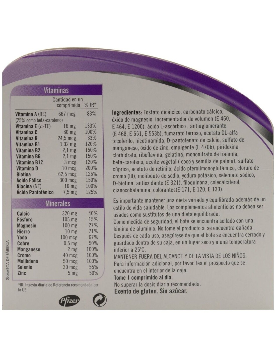 Fosfato dicálcico, carbonato cálcico, óxido de magnesio, incrementador de volumen (E 460, E 464, E 1200), ácido L-ascórbico , antiaglomerante (E 468, E 551, E 553b), umarato ferroso, acetato DL-alfa tocoferilo, nicotinamida, D-pantotenato de calcio, sulfato de manganeso, óxido de zinc, emulgente (E 470b), piridoxina clorhidrato, riboflavina, gelatina, mononitrato de tiamina, beta-caroteno, aceite vegetal ( coco y semilla de palma), sulfato cúprico, acetato de retinilo, ácido pteroilmonoglutámico, cloruro de cromo (III), molibdato de sodio, yoduro potásico, seleniato sódico, D biotina, antioxidante (E 321), filoquinona, colecalciferol, cianocobalamina, colorantes(E 171, E 120, E 133)