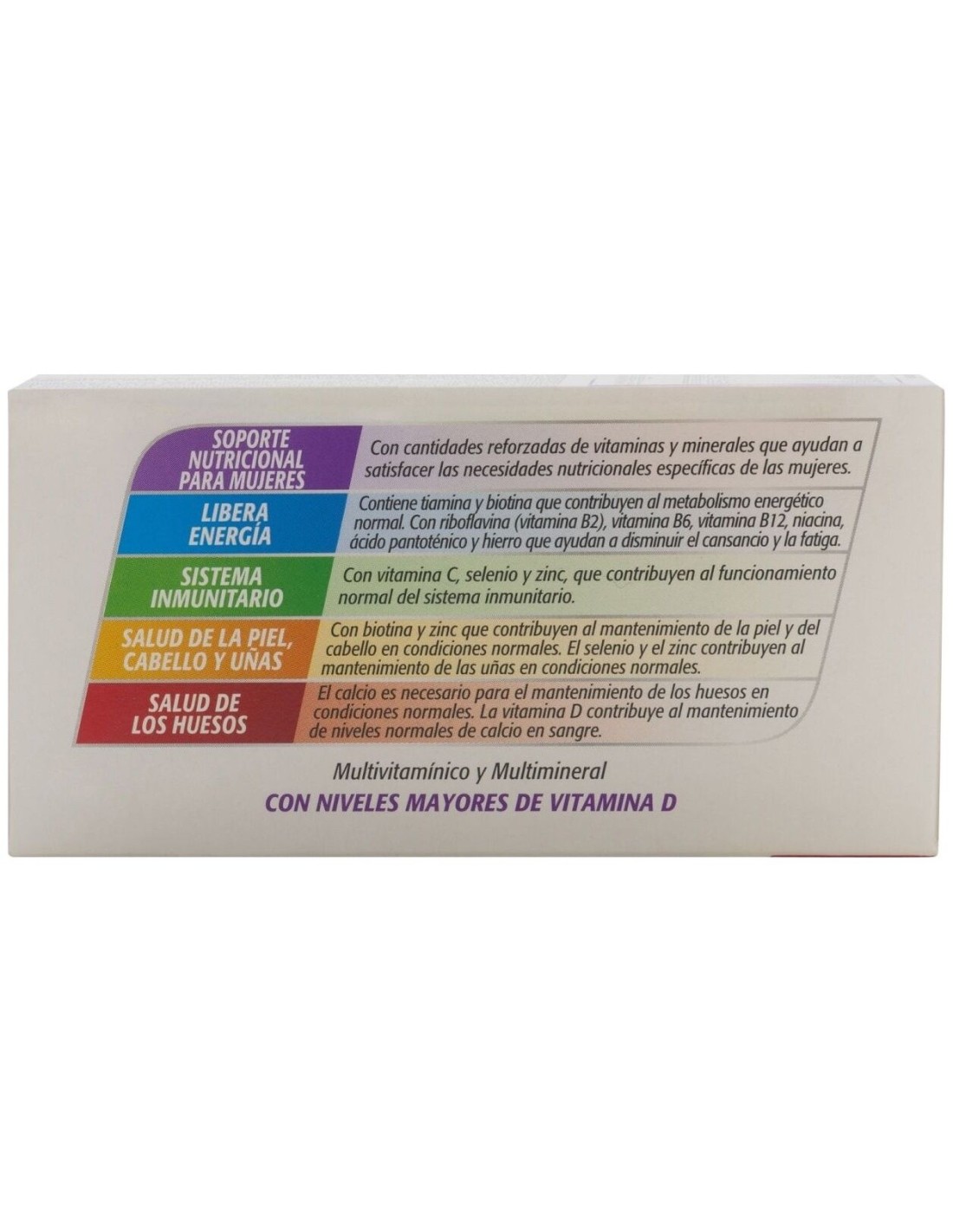 Complemento alimenticio con vitaminas y minerales ideal para mujeres a partir de 18 años. Ayuda a cubrir las necesidades nutricionales de las mujeres y aporta una gran variedad de vitaminas y minerales para complementar la alimentación de una forma óptima. Con alto contenido en vitamina D, que ayuda al mantenimiento de los huesos en condiciones normales y Hierro para hacer frente a las pérdidas de sangre que se producen durante la menstruación y antioxidantes para el correcto mantenimiento de la piel, cabello y uñas.