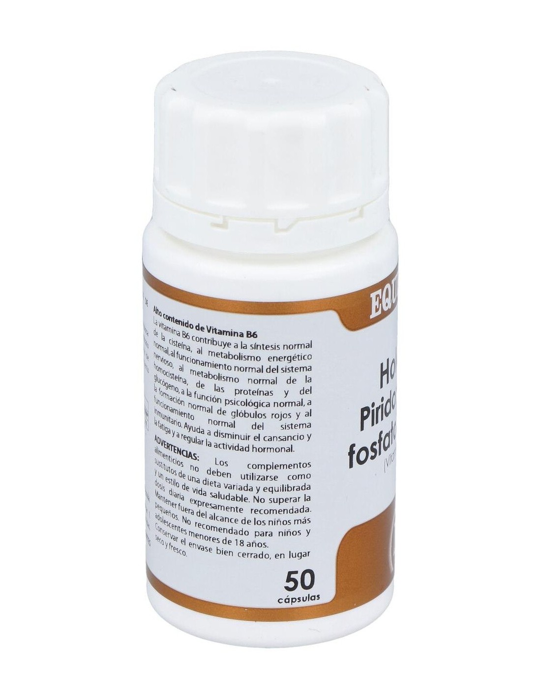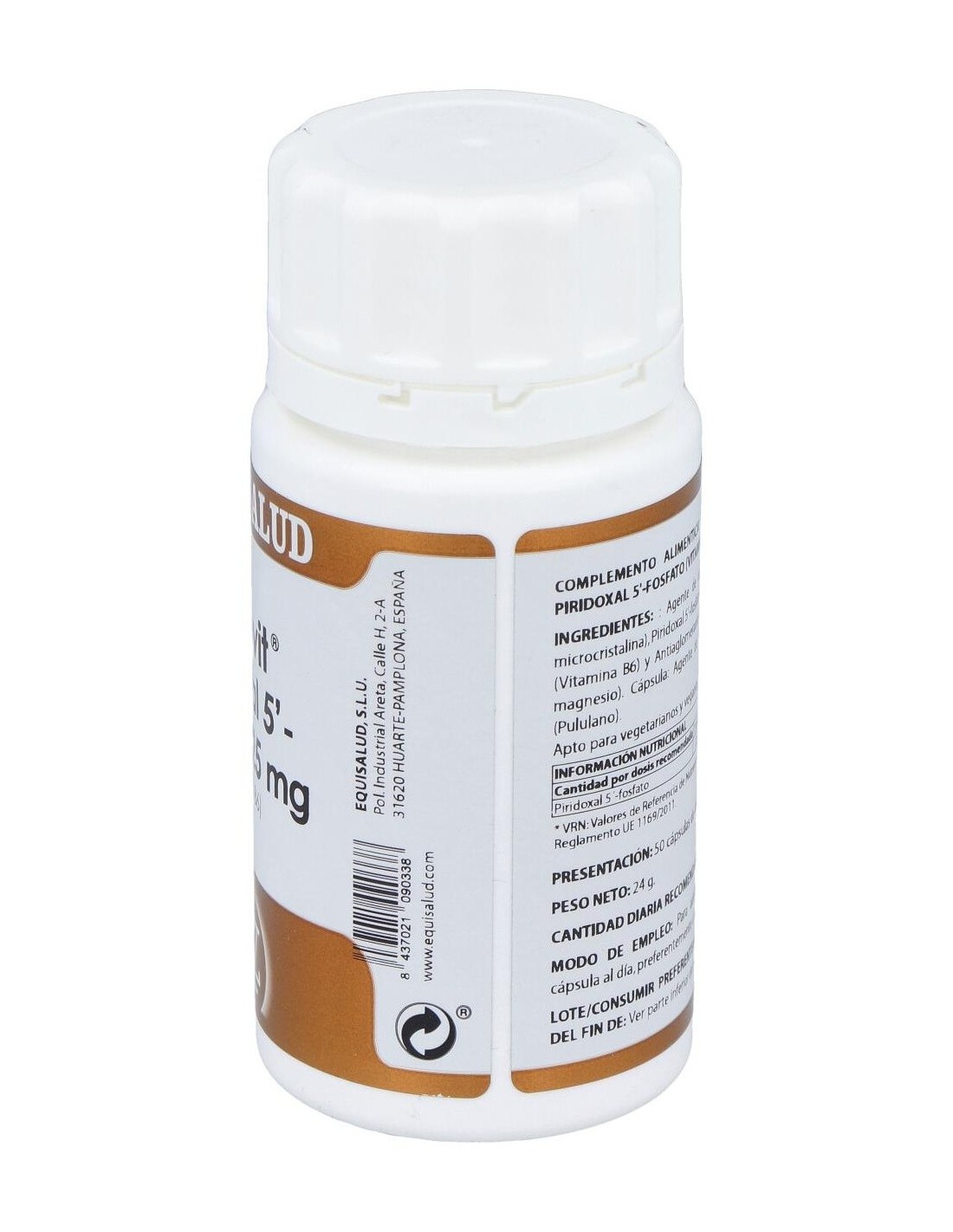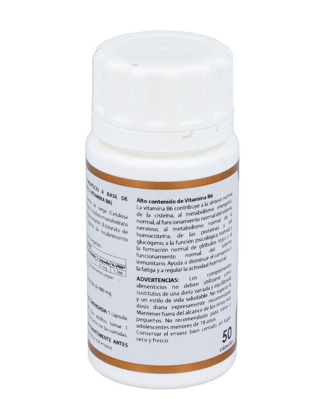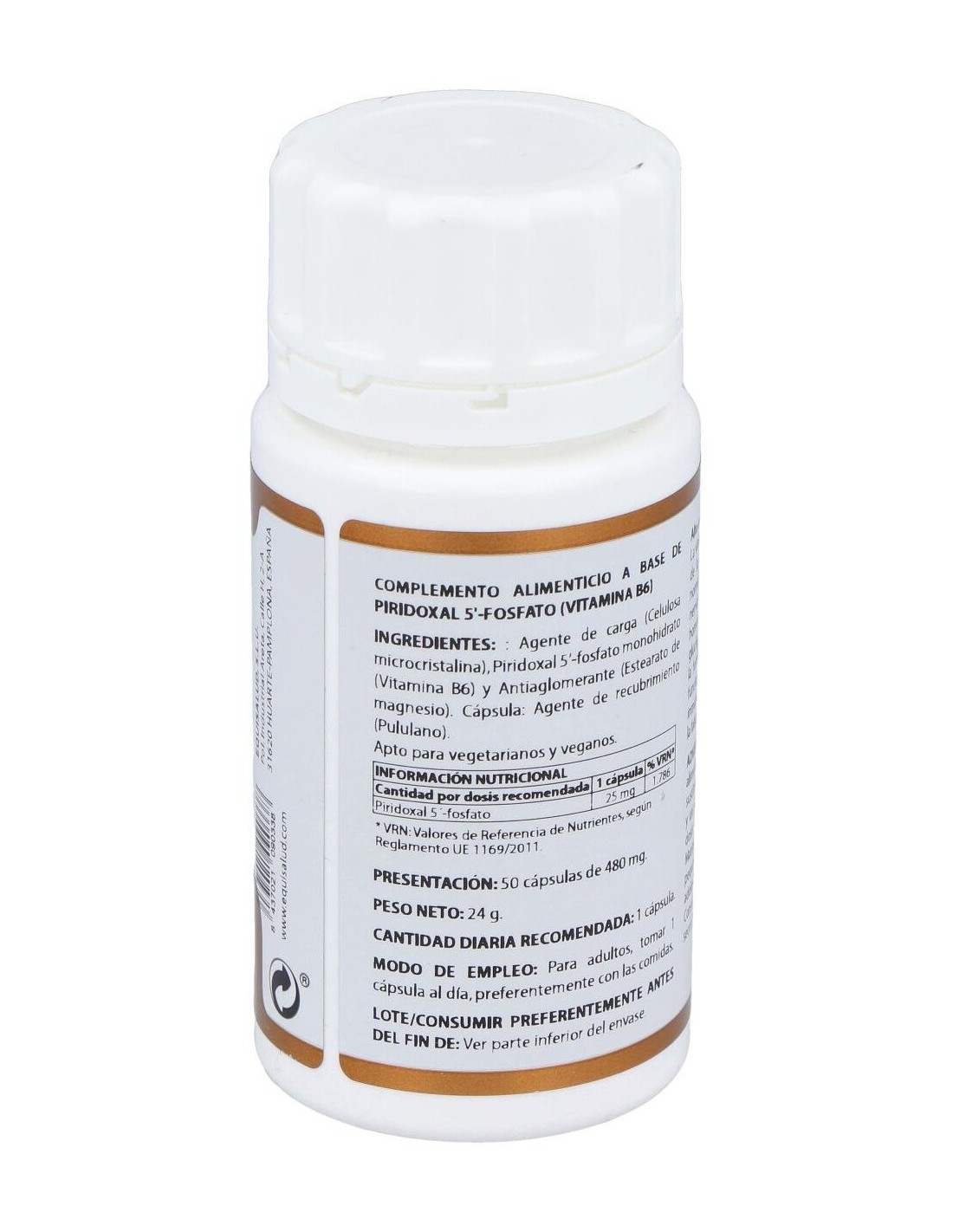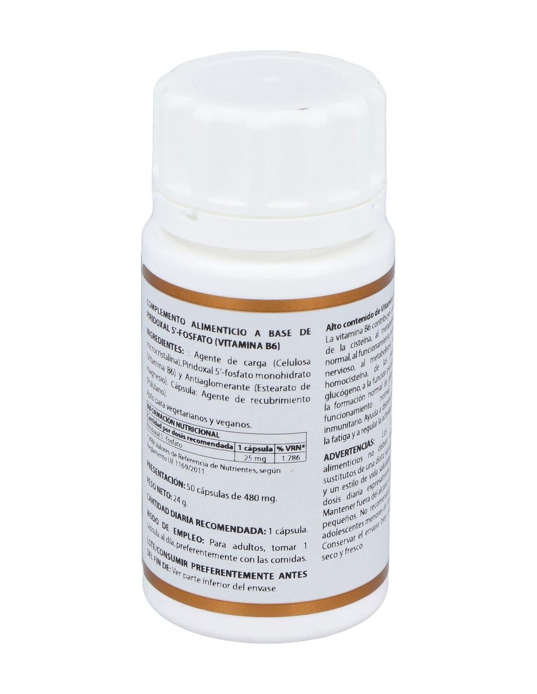 La vitamina B6 contribuye a la síntesis normal de la cisteína, al metabolismo energético normal, al funcionamiento normal del sistema nervioso, al metabolismo normal de la homocisteína, de las proteínas y del glucógeno, a la función psicológica normal, a la formación normal de glóbulos rojos y al funcionamiento normal del sistema inmunitario. Ayuda a disminuir el cansancio y la fatiga y a regular la actividad hormonal.Composición activa por cápsula:26,82 mg de piridoxal-5-fosfato monohidrato (equivalen a 25 mg de piridoxal-5-fosfato).Otros ingredientes:Envoltura: polisacárido de origen vegetal (pululano).Modo de empleo:Tomar 1 cápsula al día con una comida.Presentación:Envase de 50 cápsulas.Recomendaciones y advertencias:No contiene gluten, ni almidón, ni transgénicos, ni colorantes. Apta para vegetarianos, diabéticos y pacientes con dietas restrictivas.