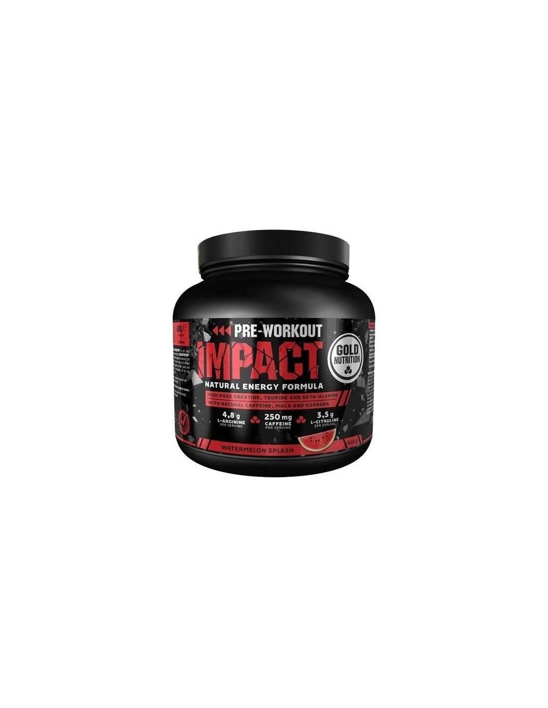 GOLD NUTRITIONPre-Workout Impact combina L-arginina (potenciador de vasodilatación), cafeína (efecto ergogénico), extractos de plantas de Maca y Guaraná, que tienen un efecto estimulante, apoyando resistencia física y disminuyendo la sensación de fatiga.