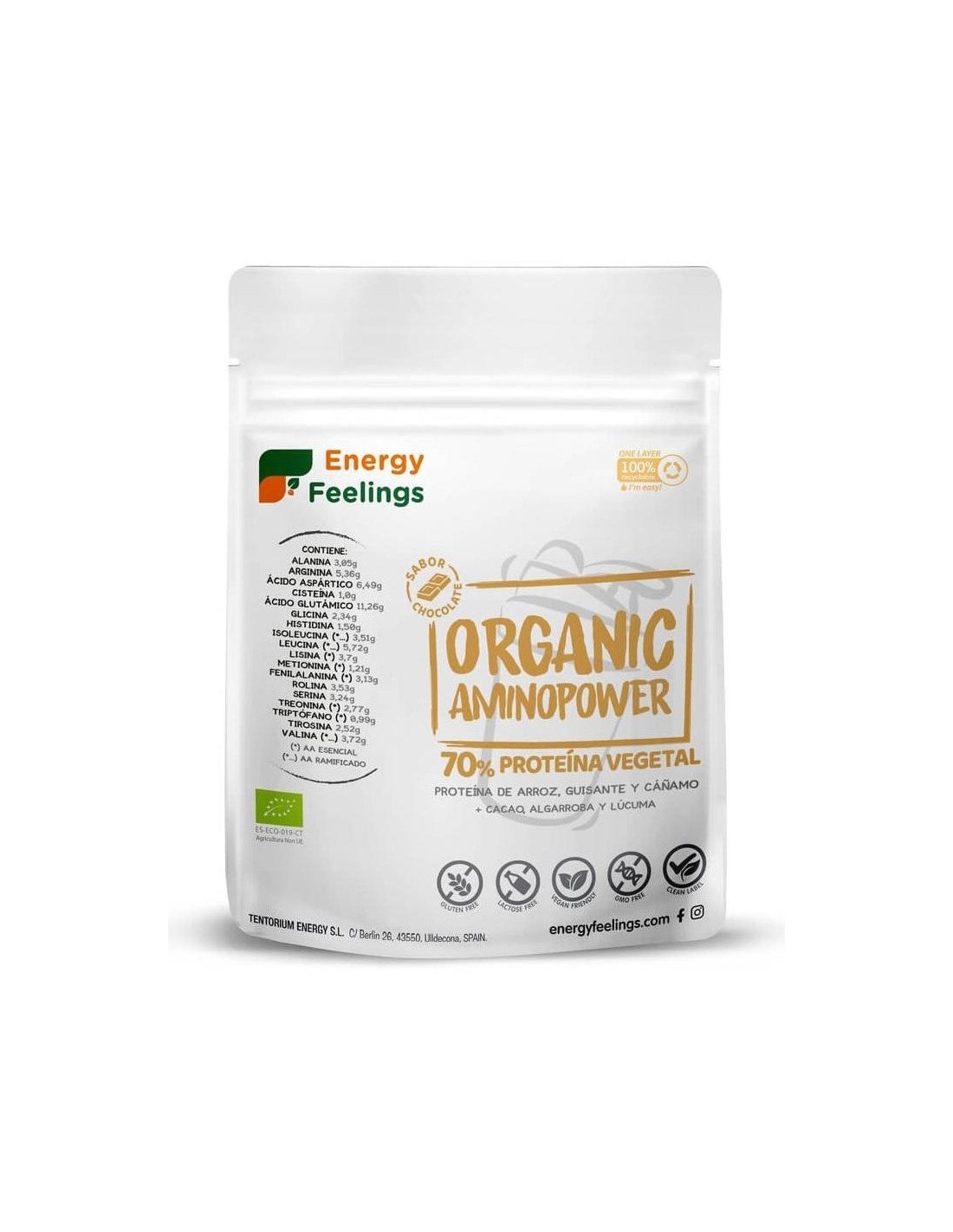 Organic Aminopower 73% Chocolate 200G Eco Vegan Sg de Energy Feelings es un snack vegano y ecológico para personas activas. Proporciona una fuente natural de aminoácidos y antioxidantes gracias a su contenido de cacao orgánico.