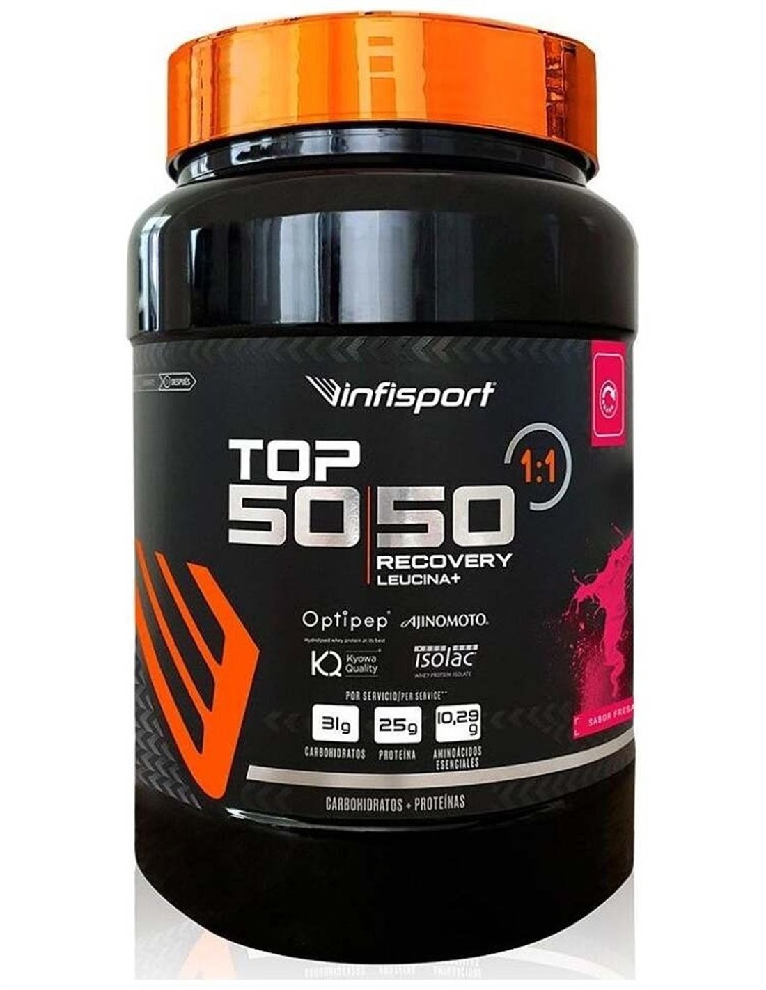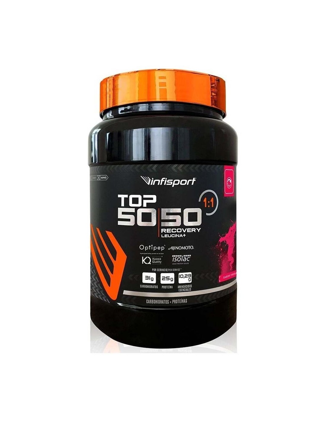 INFISPORTI TOP 50/50® RECOVERY 1:1 LEUCINA+ combina carbohidratos de alto índice glucémico con proteínas de diferente velocidad de absorción en proporción 1:1, L leucina (100% Ajinomoto Co.) y L-glutamina (Kyowa Quality®). Además, es una fuente de vitaminas A, D, E, C y grupo B. Su contenido en vitamina C, B2, B3, B5, B6, B9 y B12 ayuda a disminuir el cansancio y la vitamina C, E y B2 contribuye a la protección de las células frente al daño oxidativo. Todo ello permite obtener un batido de alta concentración proteica, sin gluten, bajo en lactosa y grasas de fácil asimilación; aportando por servicio 25 g de proteína de alto valor biológico. Por su proporción entre carbohidratos, proteínas y demás nutrientes presentes en su formulación, está recomendado para la recuperación tras la práctica de actividades deportivas de alta intensidad y 1 hora de duración.