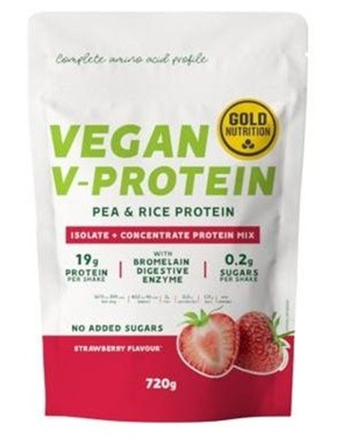 Gold Nutrition V-Protein Strawberry 720gr es un batido de proteínas que actúa como coadyuvante en procesos de pérdida de peso.