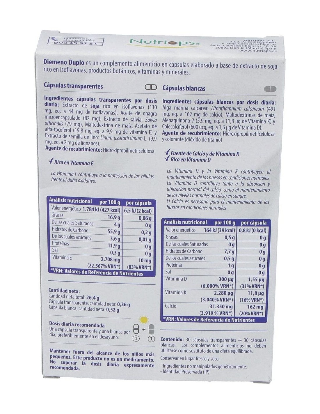 Diemeno Duplo - Cápsulas entéricas Ricas en Isoflavonas, con Calcio de Nutriops está formulado para personas que buscan complementar su dieta con nutrientes específicos que apoyan la salud ósea y el bienestar general. Este producto es adecuado para quienes desean una fuente confiable de isoflavonas y calcio en una presentación de fácil absorción.