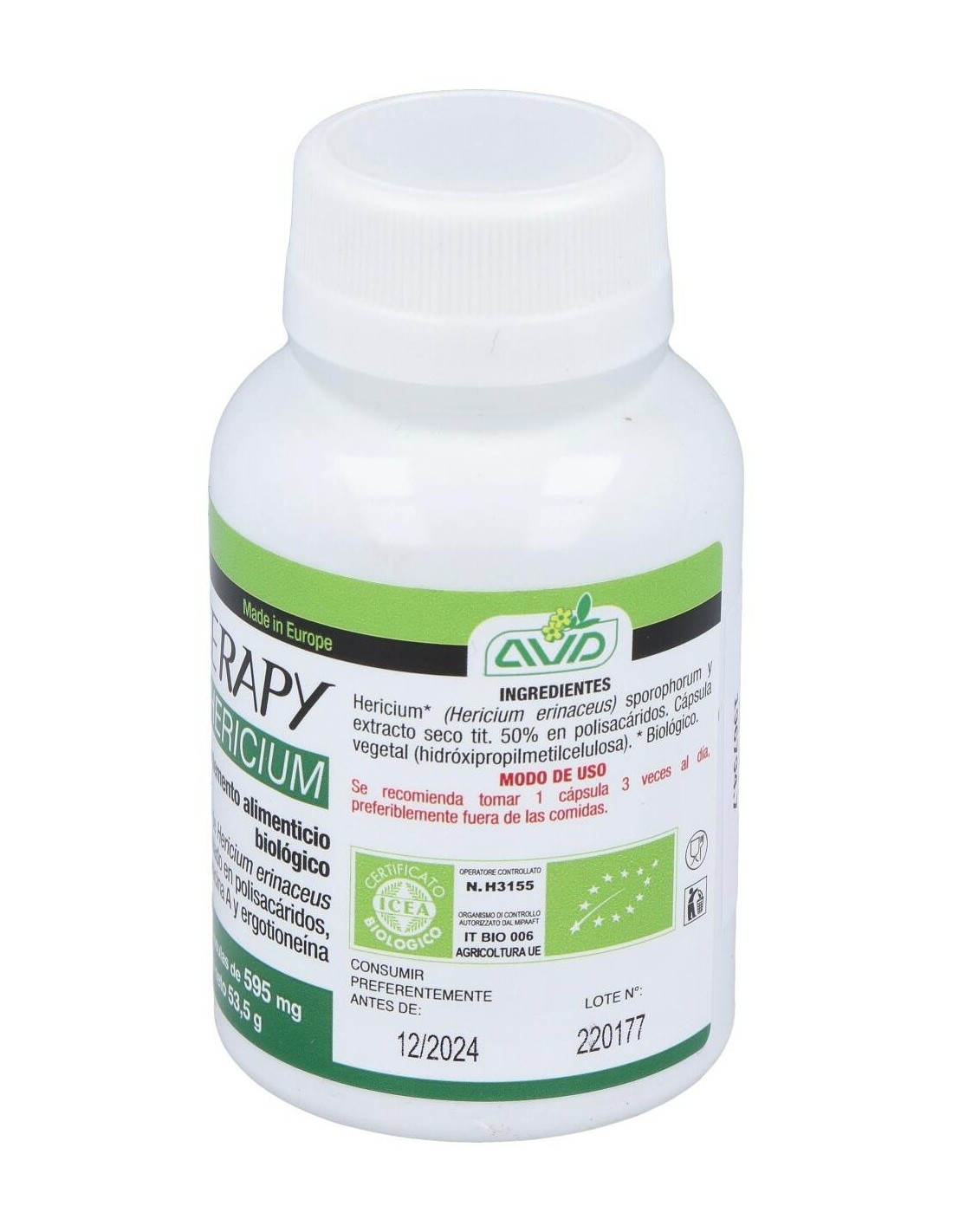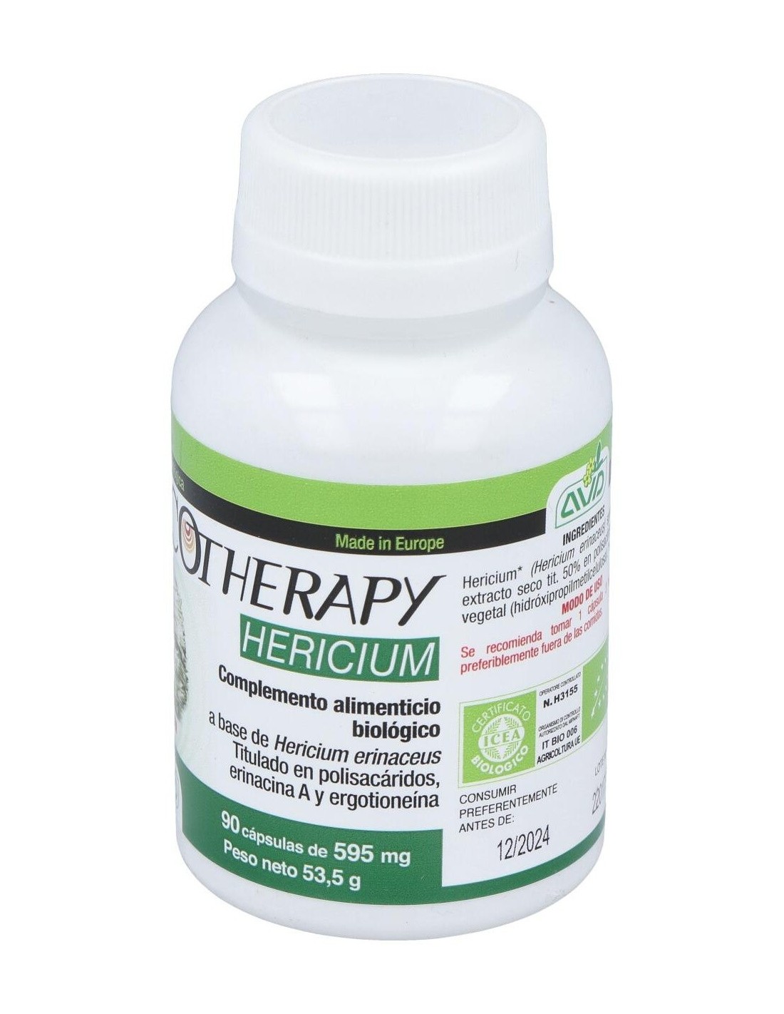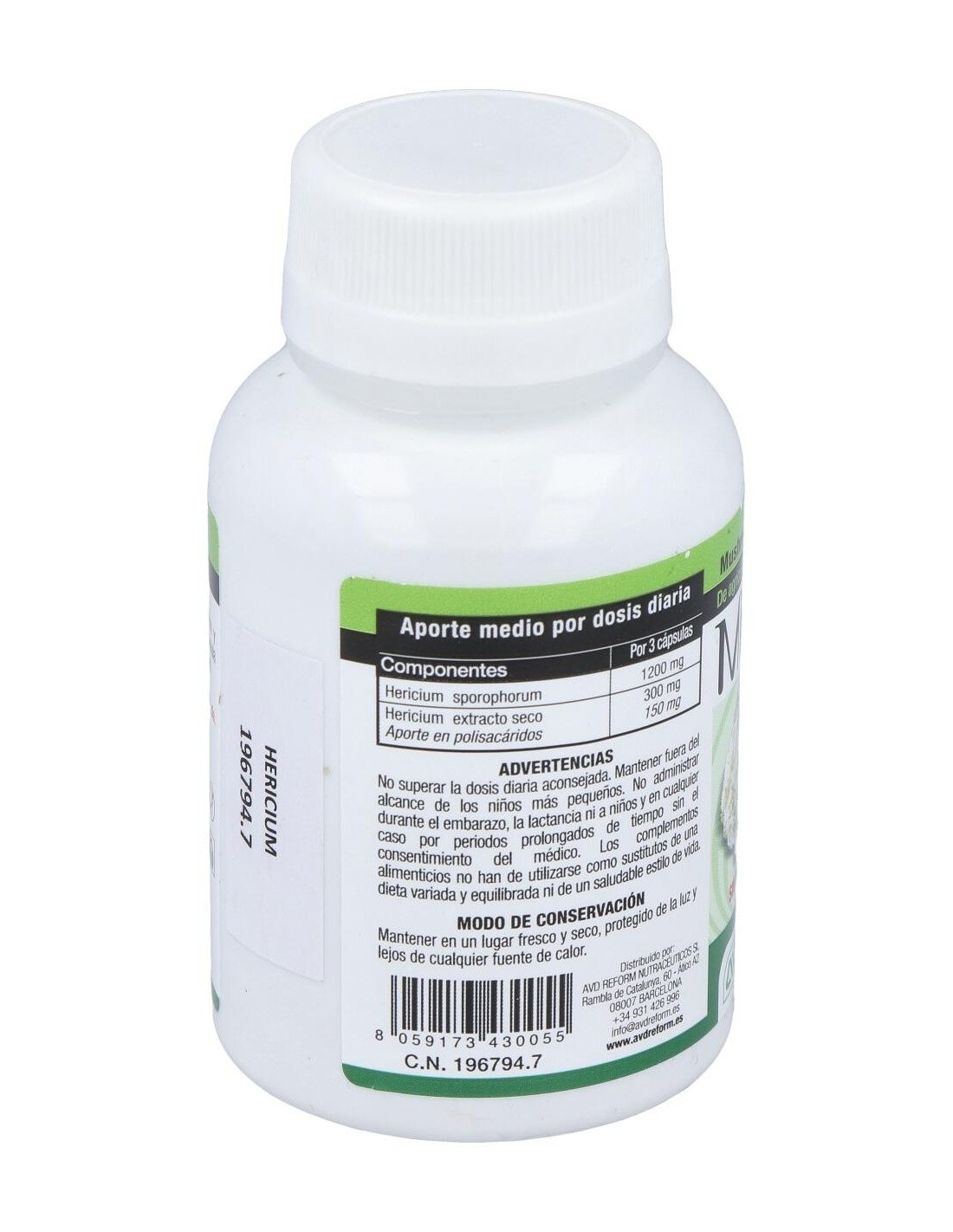 El Hericium también llamado «melena de león» u «hongo de mono», el Hericium tiene propiedades antiinflamatorias y curativas, se usa tradicionalmente para todos los problemas gástricos, pero también para promover el mantenimiento de las funciones cognitivas normales.Hericium es el hongo del sistema digestivo y del sistema nervioso. Rico en vitaminas y minerales, se usa tradicionalmente para problemas gástricos, gracias a su capacidad antiinflamatoria, curativa y de regeneración de la mucosa.Los estudios iniciados en 1991 han permitido identificar compuestos de bajo peso molecular en el Hericium erinaceus, como son las erinacinas y ericenonas, capaces de cruzar la barrera hematoencefálica y estimular la regeneración de mielina, promoviendo el mantenimiento de las funciones cognitivas normales.Composición activa por 3 cápsulas: