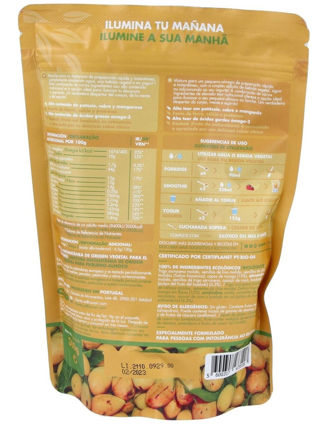 Mezcla para desayuno de despertar de Buda con Mango y Baobab de la marca Iswari, mezcla para un desayuno de preparación rápida e instantánea, simplemente añadiendo agua o una bebida vegetal. Esta combinación de varios ingredientes con alto contenido nutricional es la opción ideal para iluminar tu desayuno o merienda. El perfecto equilibrio entre hidratos de carbono, proteínas, grasas saludables y micronutrientes esenciales. El producto contiene alto contenido de manganeso, magnesio, fósforo, cobre y fibra. Alto contenido de ácidos grasos omega-3. El producto cumple los estándares europeos y es testado periódicamente para la detección de metales pesados, pesticidas y otros contaminantes. El baobab (Fruto del baobab): es consumido y apreciado por su delicioso sabor cítrico. Este producto cumple los estándares europeos y es testado periódicamente para la detección de metales pesados, pesticidas y otros contaminantes. AVISO DE ALERGÉNIOS: Sin gluten. Contiene frutos de cáscara (almendras). Puede contener trazas de granos de sésamo, avena (sin gluten), cacahuetes y de frutos de cáscara (avellanas).