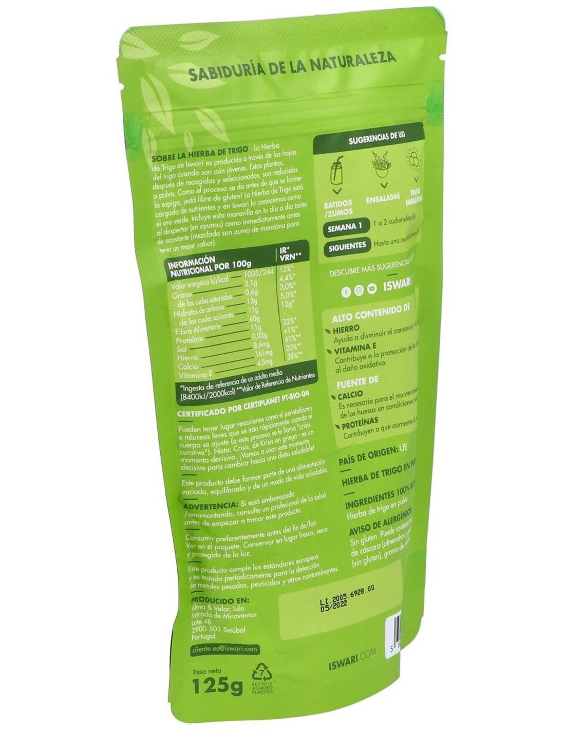 La Hierba de Trigo de Iswari se produce a través de las hojas jóvenes del trigo.Como el proceso se da antes de espigar, la Hierba de Trigo está exenta de gluten!Ingredientes: 100% hierba de trigo.Beneficios: