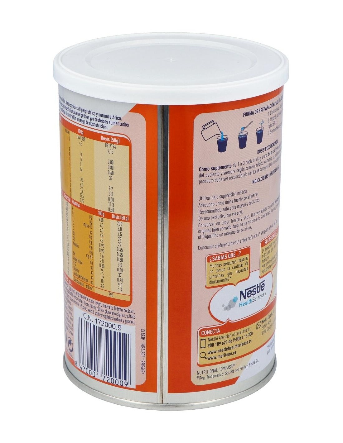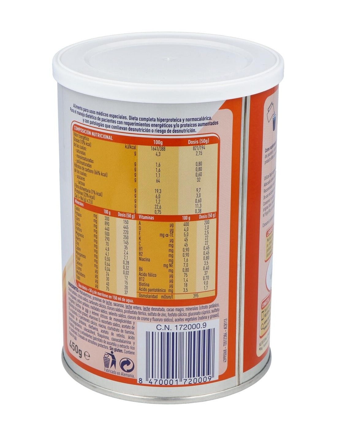 Maltodextrinas, proteínas de leche, sacarosa, leche entera, leche desnatada, cacao magro, minerales (citrato potásico, cloruro potásico, citrato sódico, carbonato cálcico, cloruro sódico, pirofosfato férrico, sulfato de zinc, fosfato cálcico, gluconato cúprico, sulfato de manganeso, yoduro potásico, molibdato sódico, selenito sódico, cloruro de cromo y fluoruro sódico), aceites vegetales (nabina y girasol), emulgentes (lecitina de soja y ésteres cítricos de monoglicéridos y diglicéridos de ácidos grasos), vitaminas (L-ascorbato sódico, acetato de DL-alfa- tocoferilo, D pantotenato cálcico, niacina, clorhidrato de tiamina, clorhidrato de piridoxina, riboflavina, acetao de retinilo, ácido pteroilmonoglutámico, colecalciferol, filoquinona, cianocobalamina y D-biotina), aromas y antioxidantes (palmitato de ascobilo y extracto rico en tocoferoles).