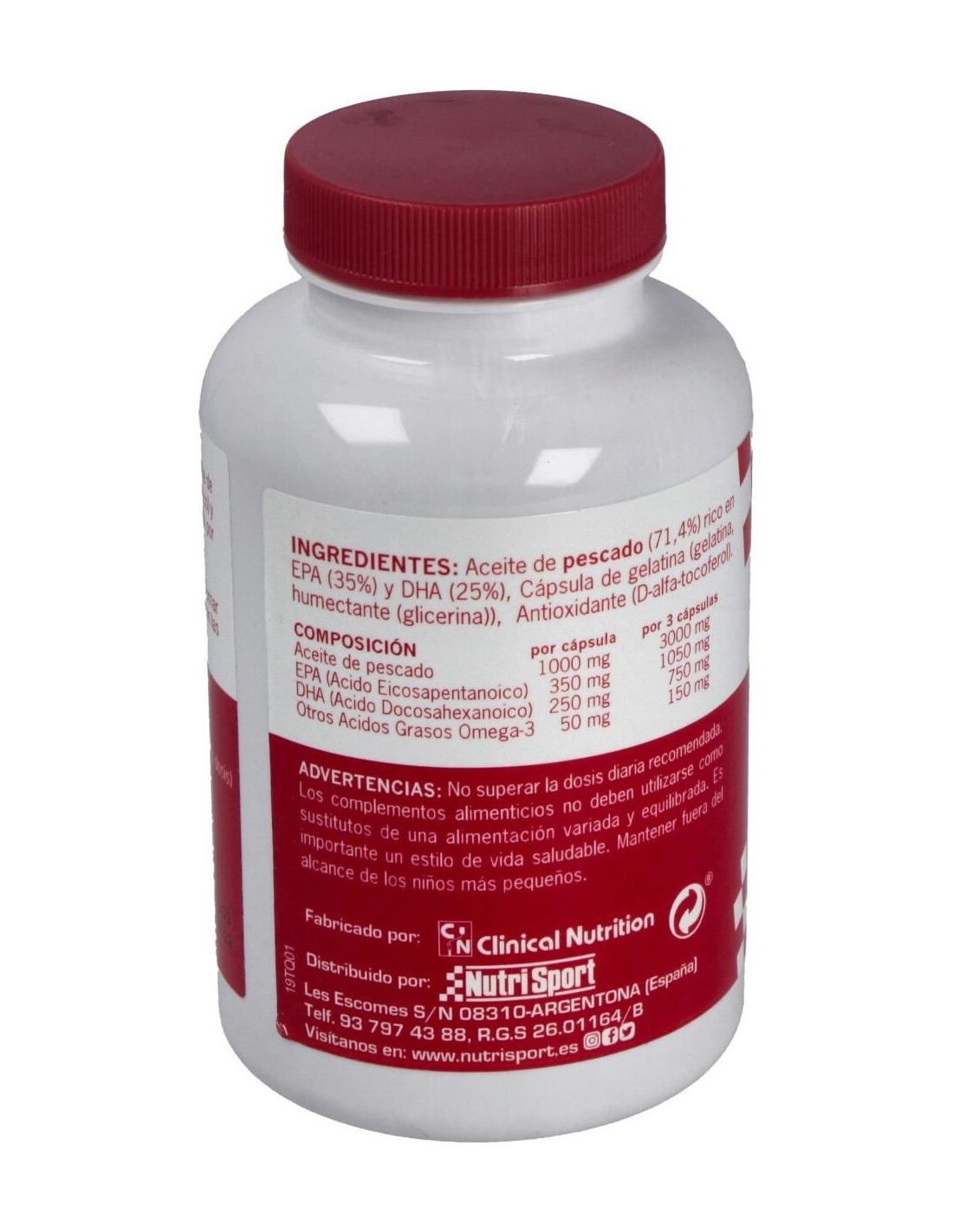Omega-3 + Nutrisport es un complemento alimenticio que aporta una proporción de 350 mg de EPA y 250 mg de DHA, indicado para aquellas personas que deseen añadir más omega 3 a su pauta alimentaria saludable.