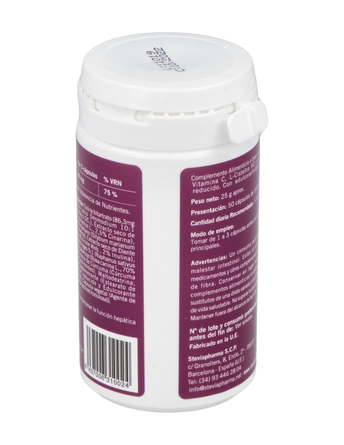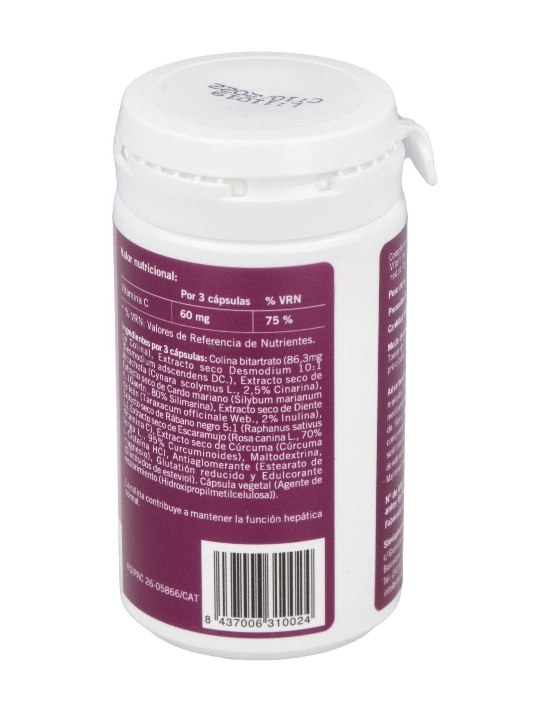 Complemento alimenticio en forma de cápsulas, elaborado a base de extractos naturales de cardo mariano, desmodium, alcachofera o rábano negro, que está especialmente indicado para favorecer el normal funcionamiento de las funciones hepática y biliar.