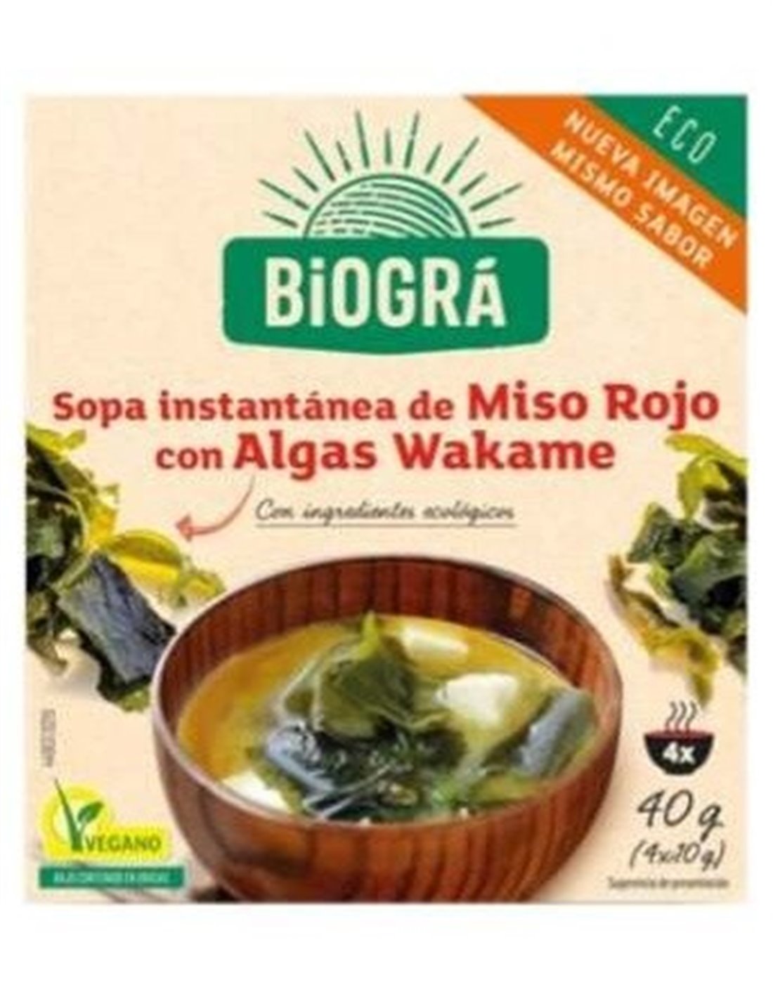 La sopa de miso vegetariana de Biográ es un elemento básico de la cocina japonesa y es un alimento con algas que se sirve en el desayuno, el almuerzo y la cena. Este caldo o nutritiva sopa no es un plato que se sirve solo, sino que es un acompañante típico del arroz blanco y otras comidas. Durante el invierno, es tradicional como acompañante de platos fríos como el famoso sushi. Es común tomarlo como un reconstituyente efectivo para aliviar el resfriado. Cuando se toma, es costumbre servirlo en cuencos lacados pequeños para consumirlo directamente sin usar cuchara, aunque los componentes sólidos, si requieren la utilización de palillos para comer. Peso: 40G. Producto ARTEMIS que es libre de OGM. Se debe almacenar en lugar seco y fresco para que se conserve en buen estado.