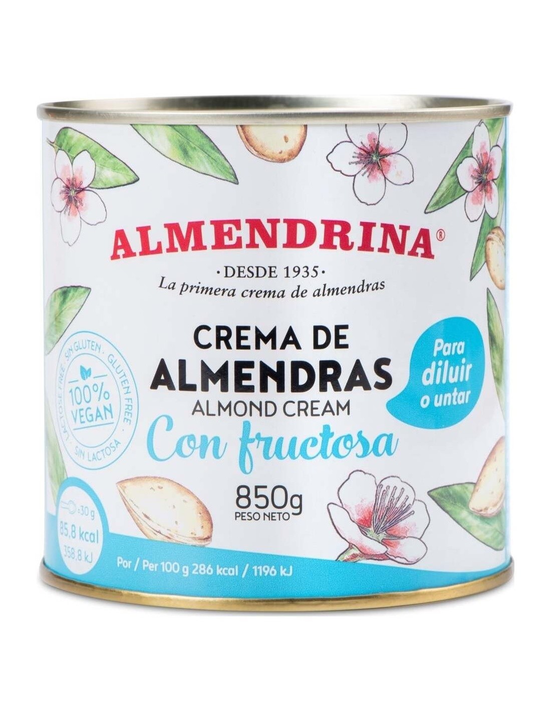 Almendrina Crema Almendras Leche sin Azúcar sin Gluten 850g es una crema de almendras tradicional con valor ecológico añadido. Elaborada con agua y almendras ecológicas, endulzada con fructosa. La almendra es un fruto rico en carbohidratos y magnesio que ayuda a mantener la salud de los dientes y contribuye a reducir el insomnio. Con potasio, vitamina E, A y B, calcio, hierro y zinc. Apta para veganos.
