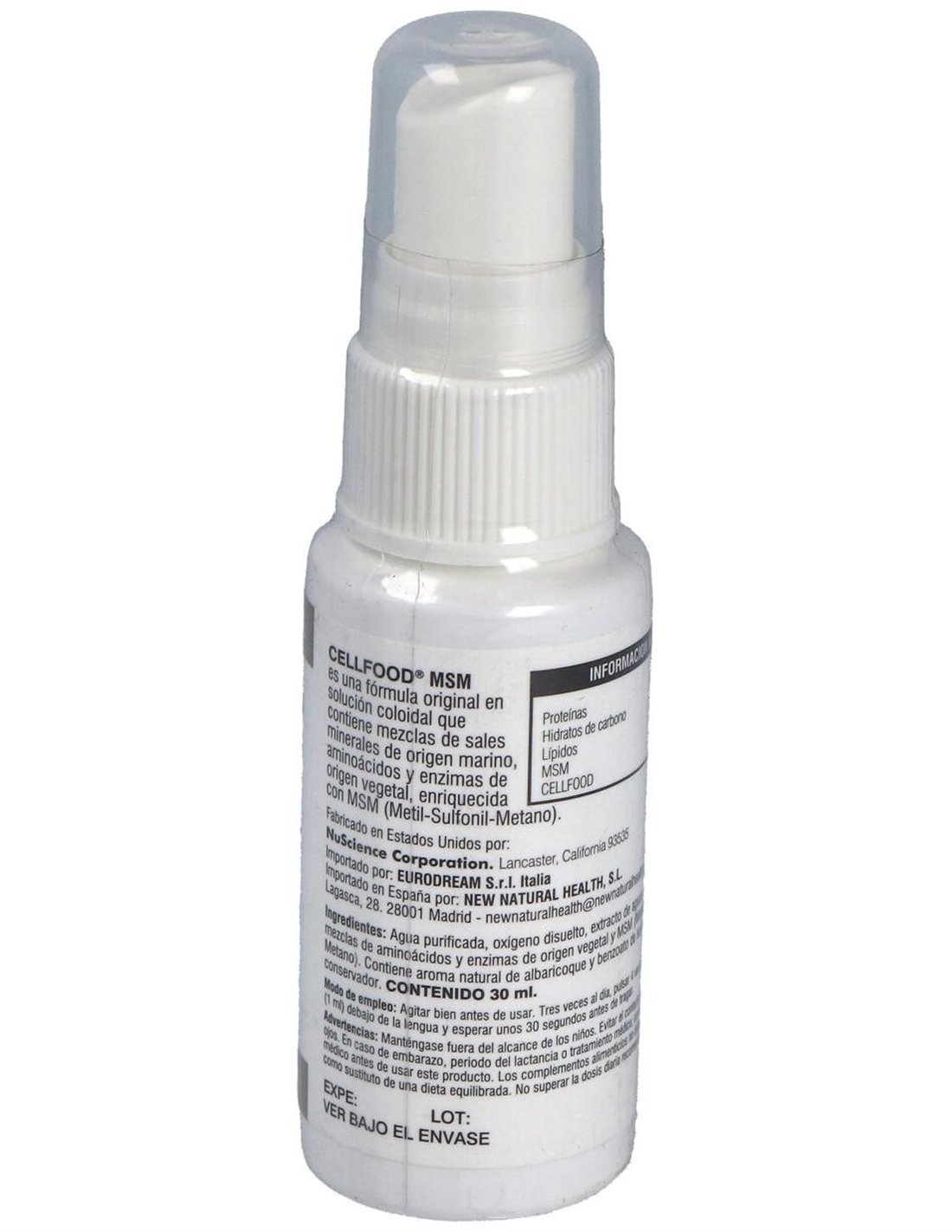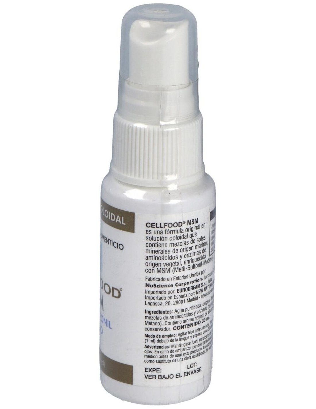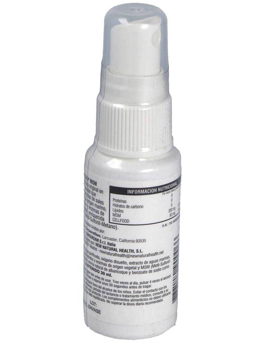 Por 12 aplicaciones: Cellfood .............................. 20 mg. MSM (metilsulfonilmetano) ... 100 mg.