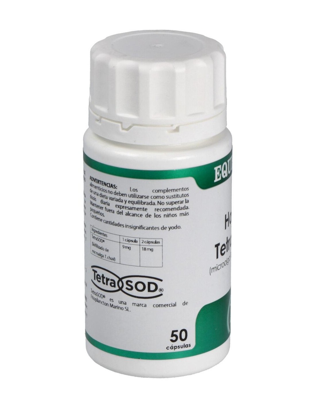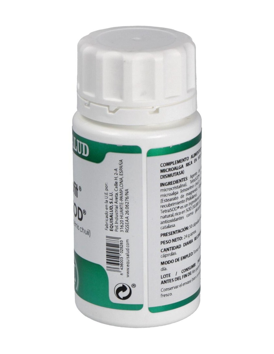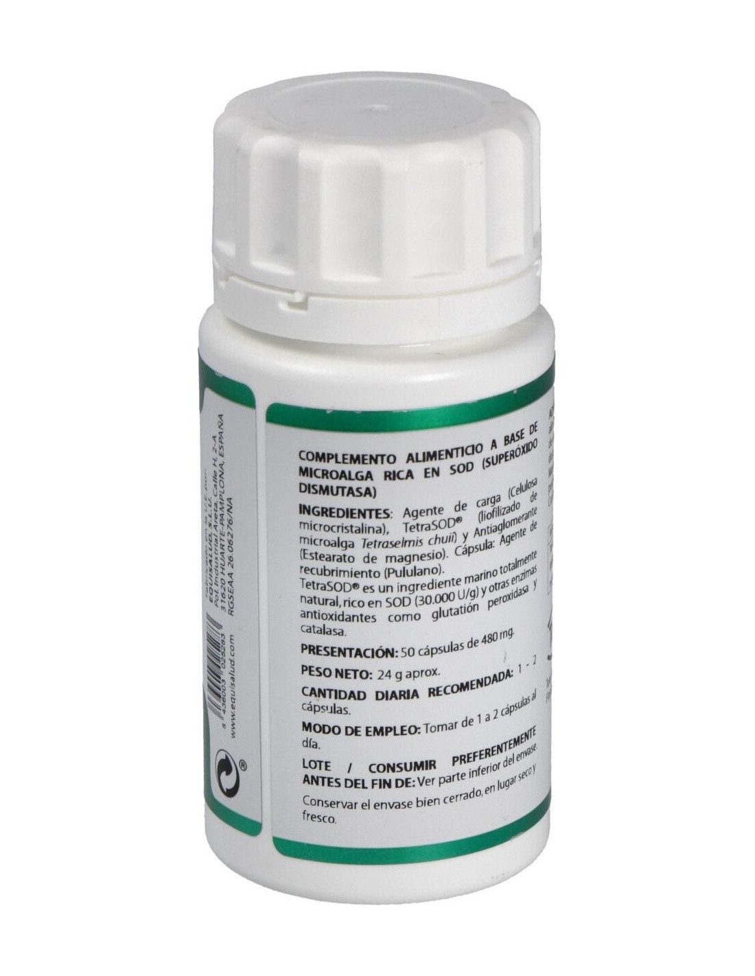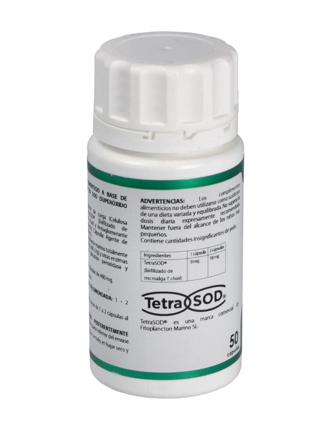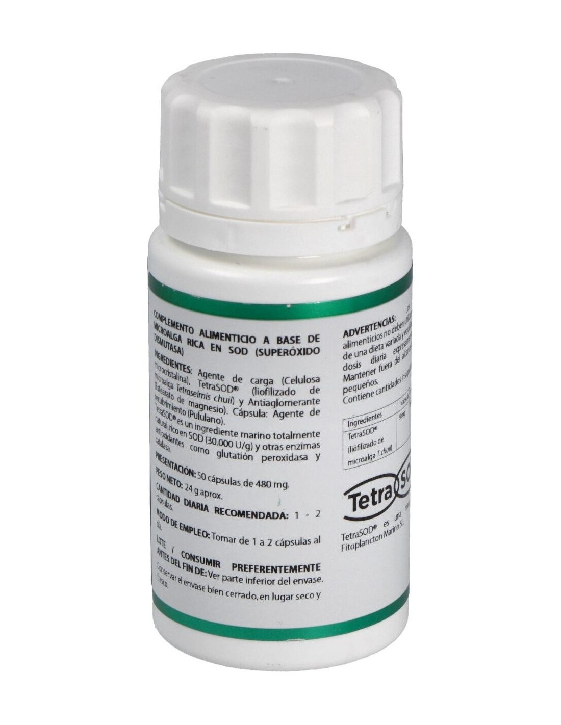 Ingredientes:TetraSOD® (liofilizado de microalga Tetraselmis chuii, rica en SOD, actividad Superóxido dismutasa > 30,000 IU/g), 9 mg. Excipientes tecnológicos: celulosa microcristalina (agente de carga), c.s. y estearato de magnesio (antiaglomerante), c.s.Modo de empleo:Tomar de 1 a 2 cápsulas al día.Presentación:Bote de 50 cápsulas.