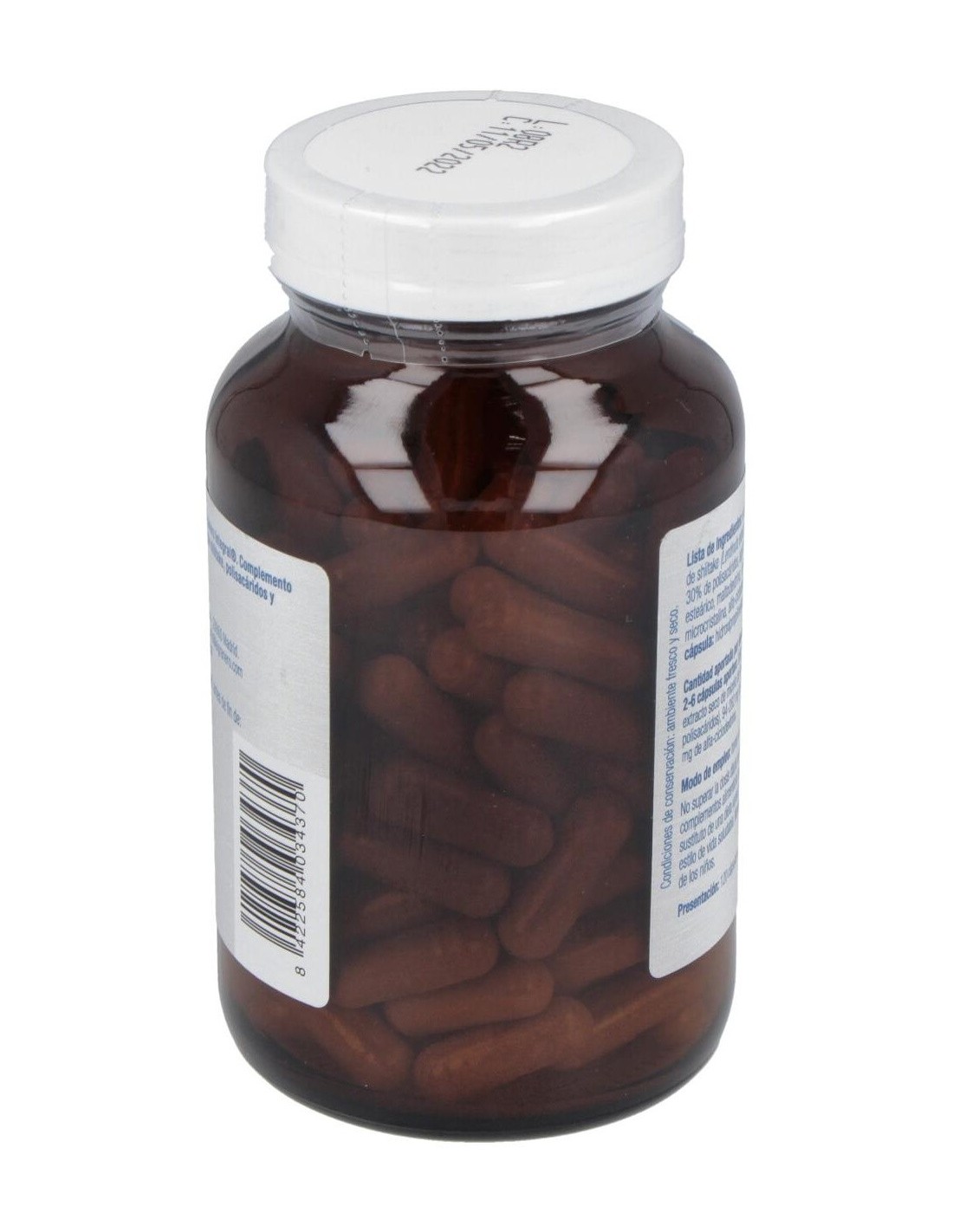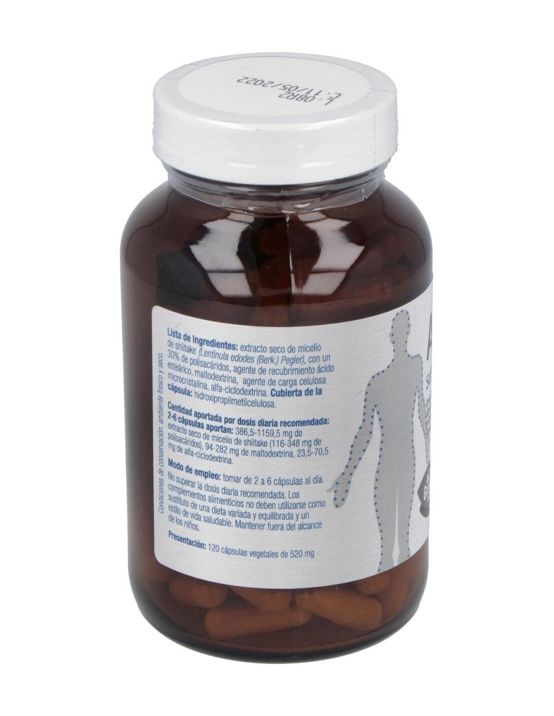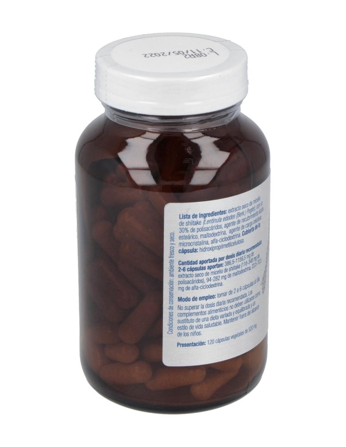 Ingredientes:Extracto seco de micelio de shiitake (Lentinula edodes (Berk.) Pegler), con un 30% de polisacáridos, agente de recubrimiento ácido esteárico, maltodextrina, agente de carga celulosa microcristalina, alfa-ciclodextrina. Cubierta de la cápsula: espesante hidroxipropilmetilcelulosa. Presentación:Envase de 120 cápsulas.