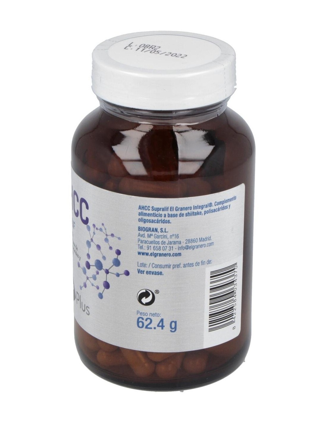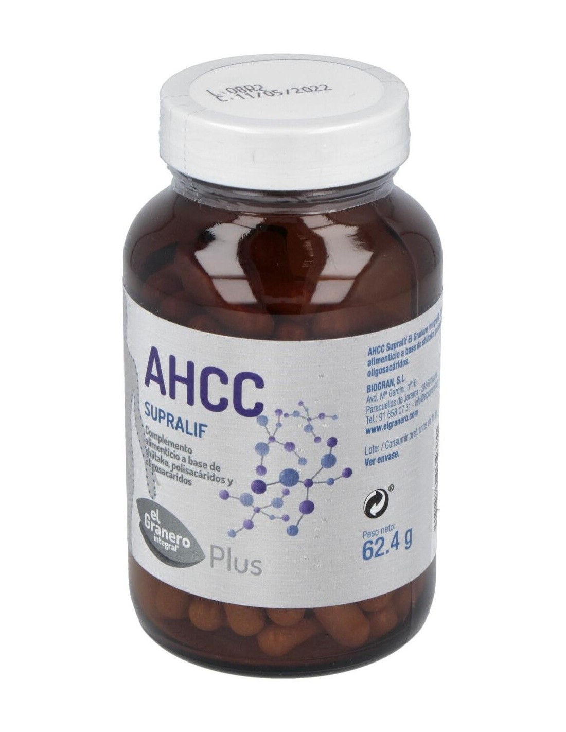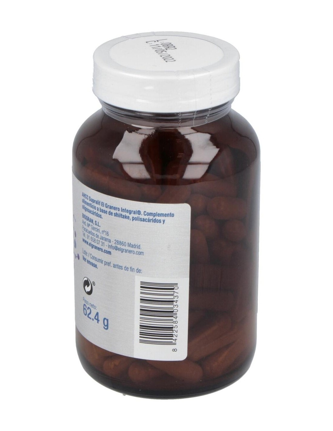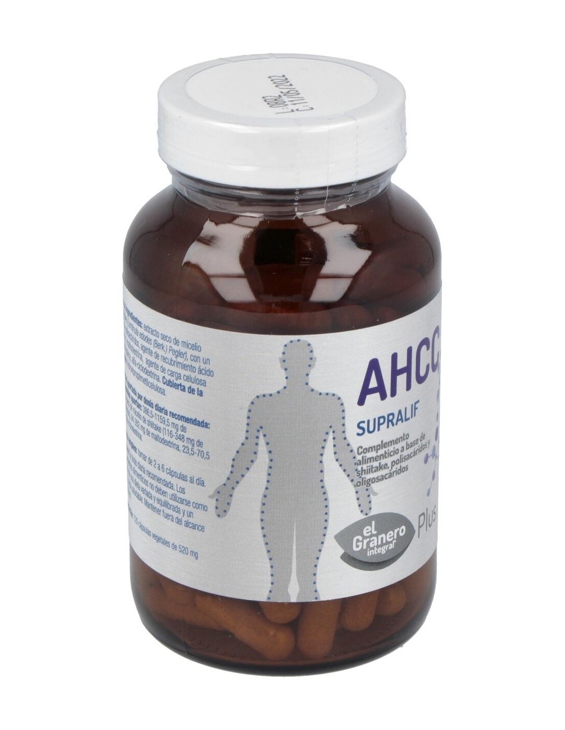 Ingredientes:Extracto seco de micelio de shiitake (Lentinula edodes (Berk.) Pegler), con un 30% de polisacáridos, agente de recubrimiento ácido esteárico, maltodextrina, agente de carga celulosa microcristalina, alfa-ciclodextrina. Cubierta de la cápsula: espesante hidroxipropilmetilcelulosa. Presentación:Envase de 120 cápsulas.