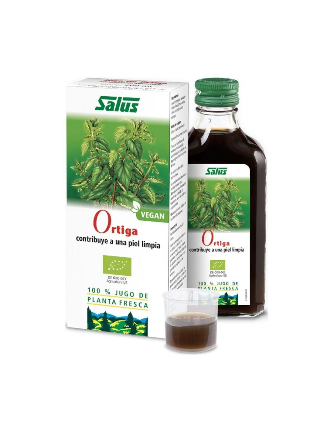 Ingredientes: Jugo natural de planta fresca de hierba de ortiga de cultivo ecológico. Modo de empleo:Tomar por la mañana y al mediodía 10 ml de jugo natural de ortiga antes de las comidas, puro o diluido en agua o en alguna infusión. Presentación:Frasco de 200 ml.