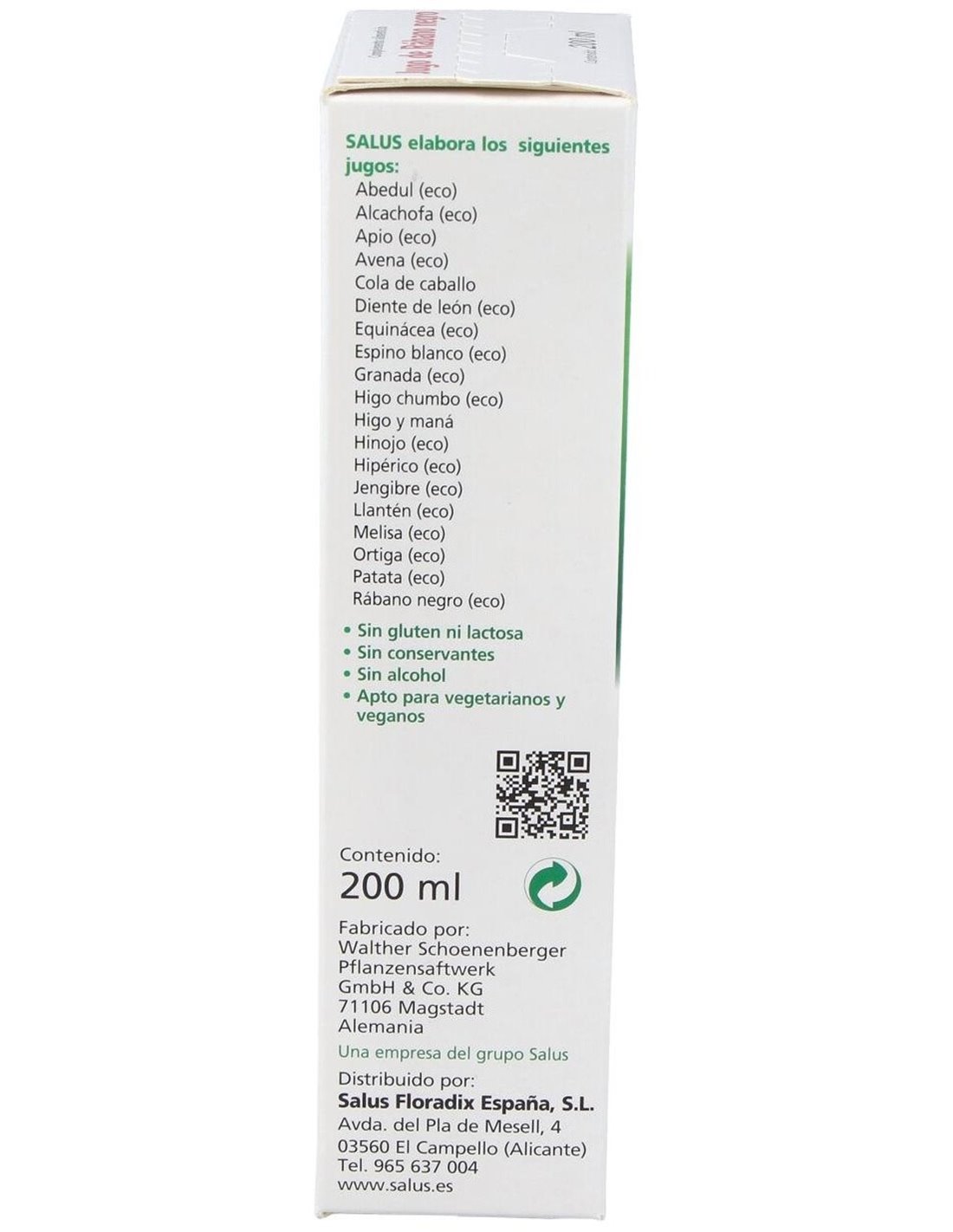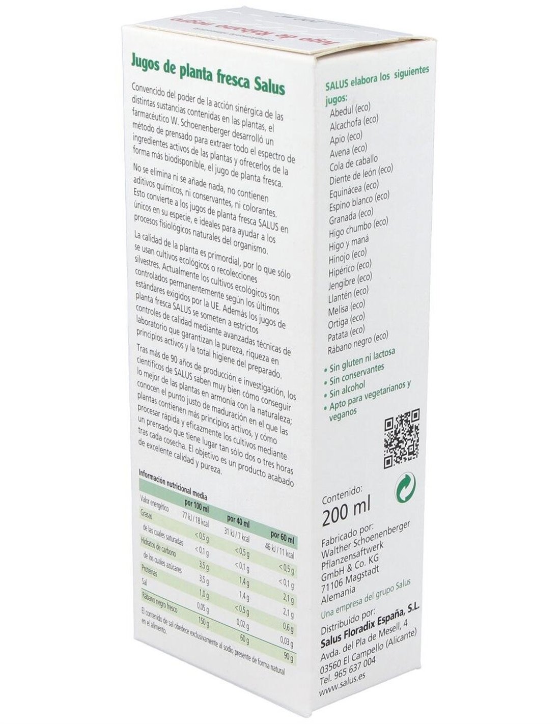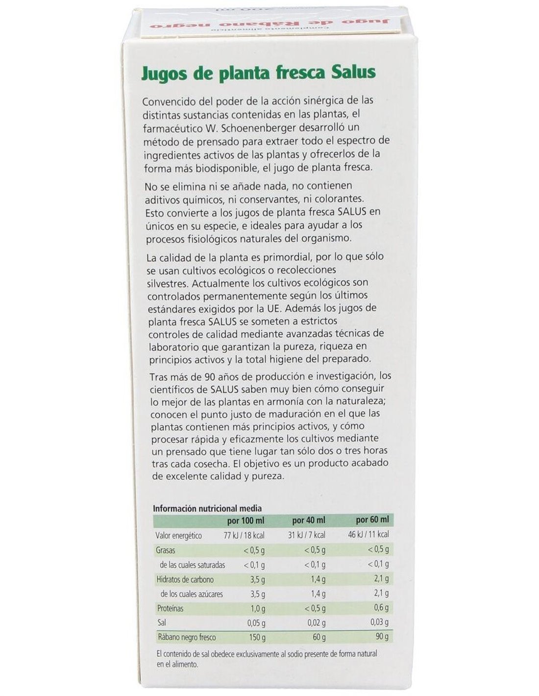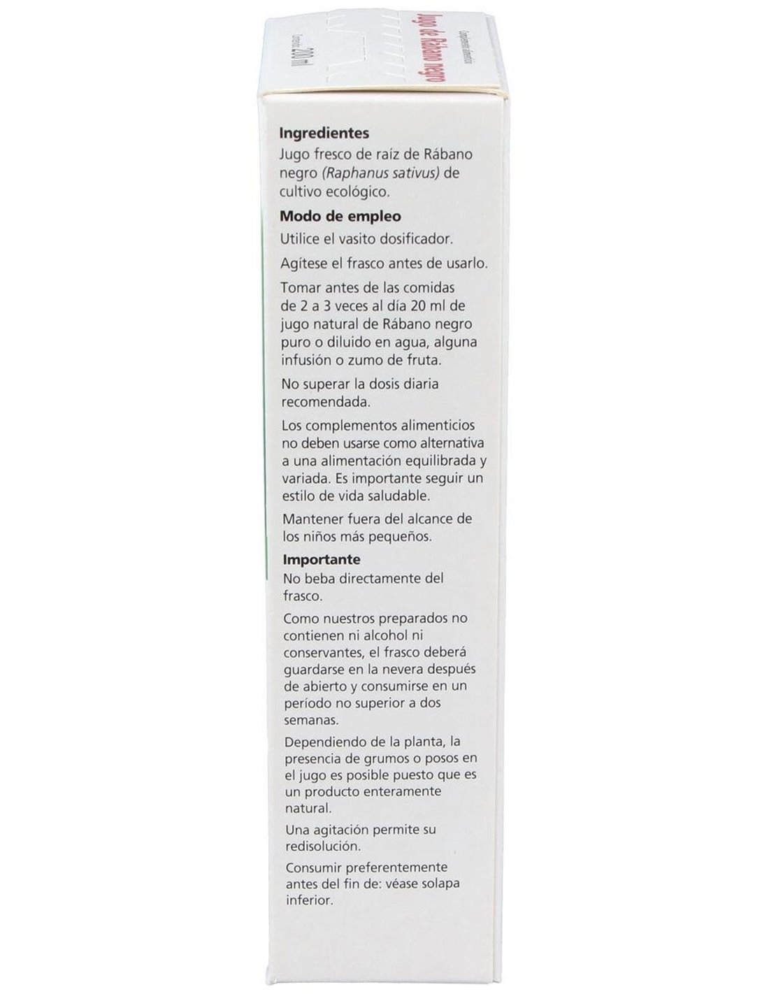 Ingredientes: Jugo fresco de raíz de Rábano negro (Raphanus sativus) de cultivo ecológico.Modo de empleo:Tomar antes de las comidas de 2 a 3 veces al día 20 ml de jugo natural de Rábano negro puro o diluido en agua, alguna infusión o zumo de fruta.Presentación:Envase de 200 ml.Recomendaciones y advertencias:No contiene gluten, lactosa, alcohol, conservantes ni colorantes. Apto para vegetarianos y veganos.