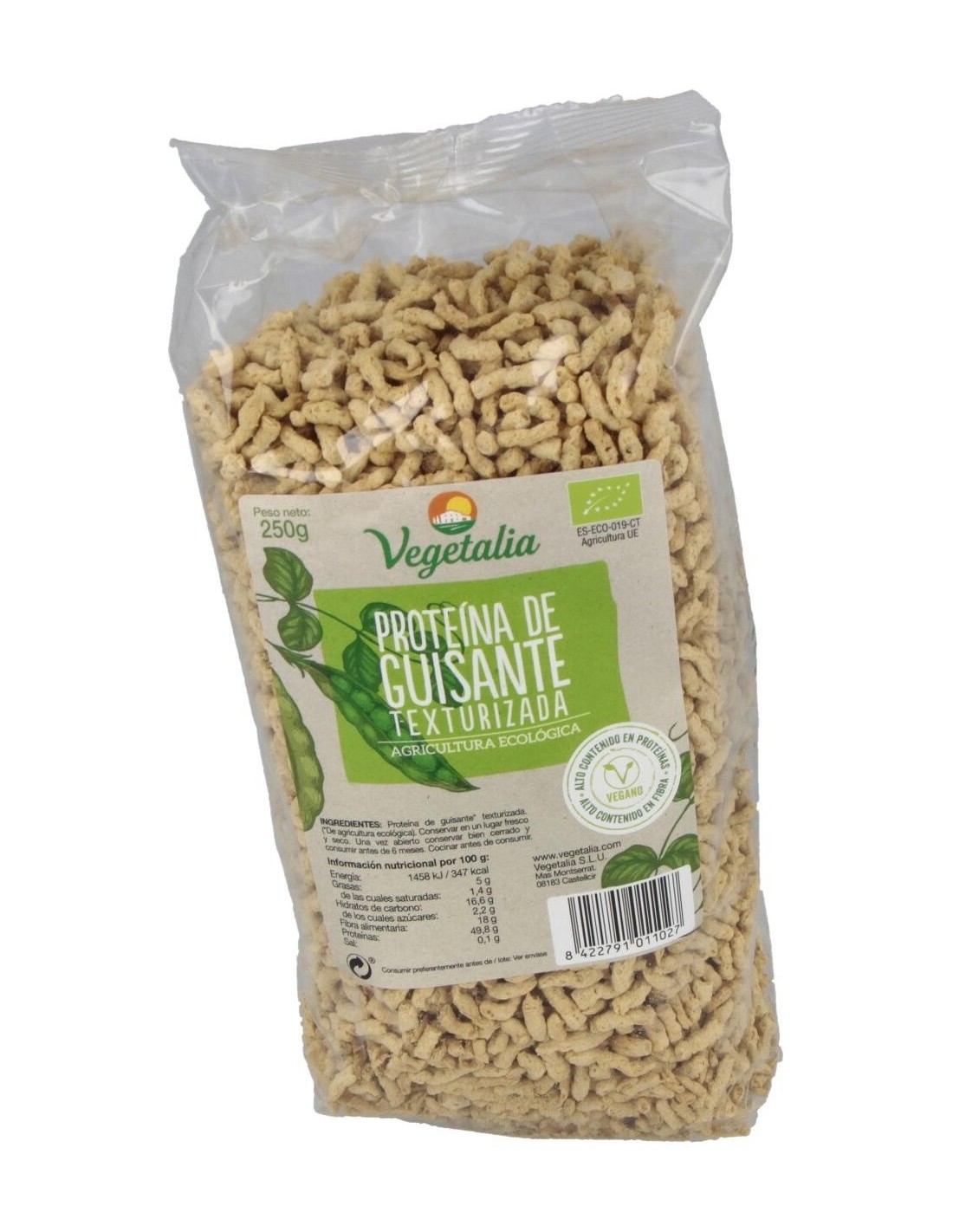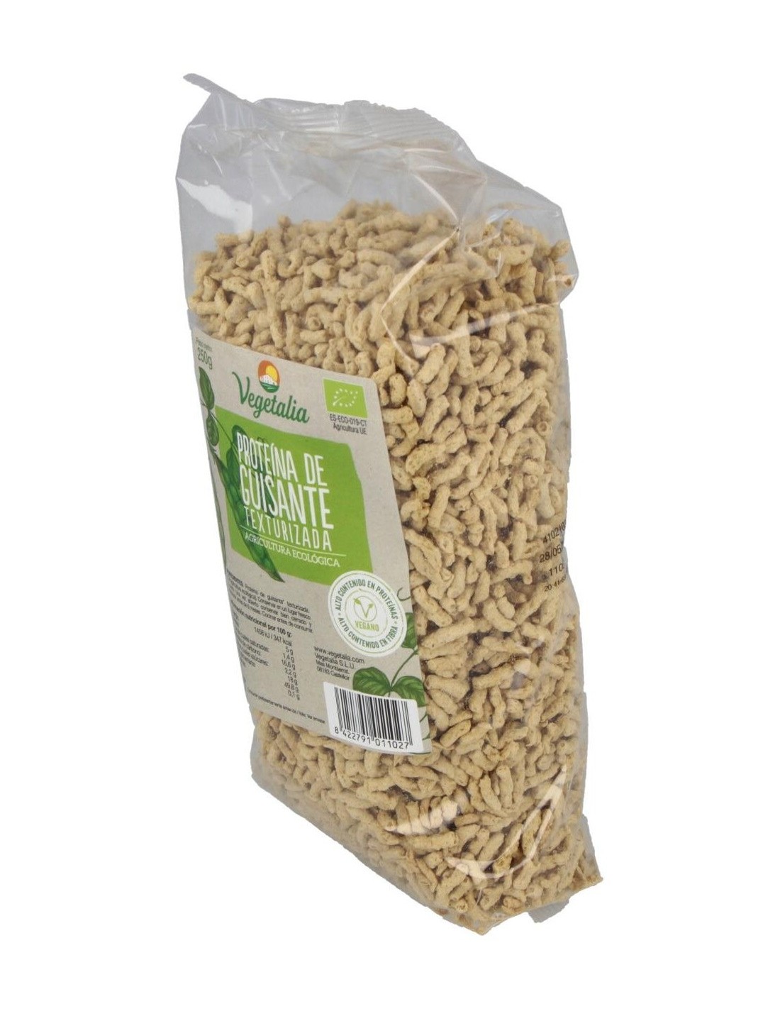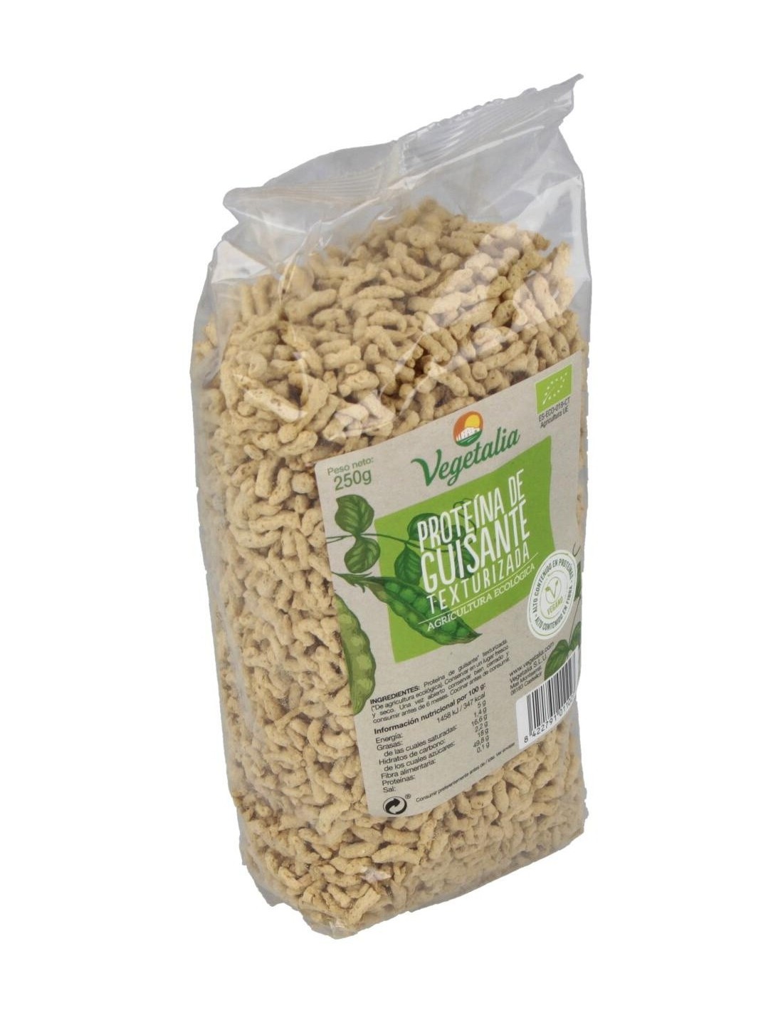 Proteína de guisante texturizada biológica con alto contenido en proteínas y fibras. Elaborado a partir de guisantes procedentes de agricultura ecológica, es un producto recomendado para reemplazar carnes y pescados. Contiene grandes cantidades de arginina, lisina y aminoácidos ramificados. Es una alternativa a la soja texturizada, indicado para aquellas personas que sufren de intolerancia a la soja. Cocinar antes de consumir. Apto veganos.