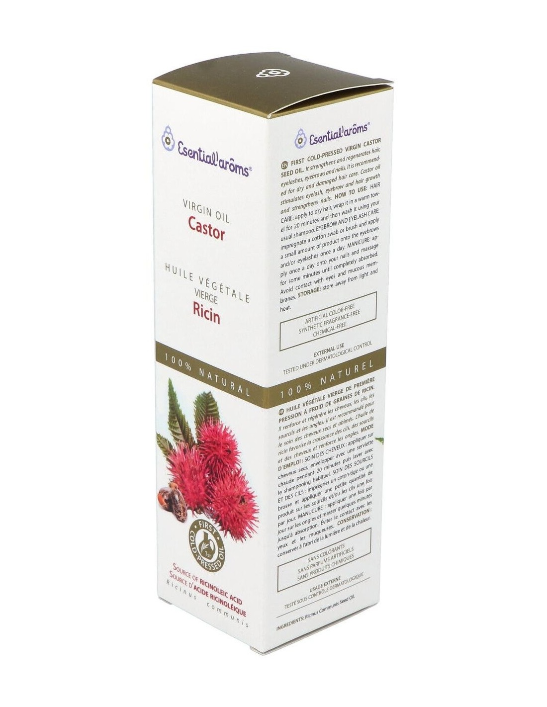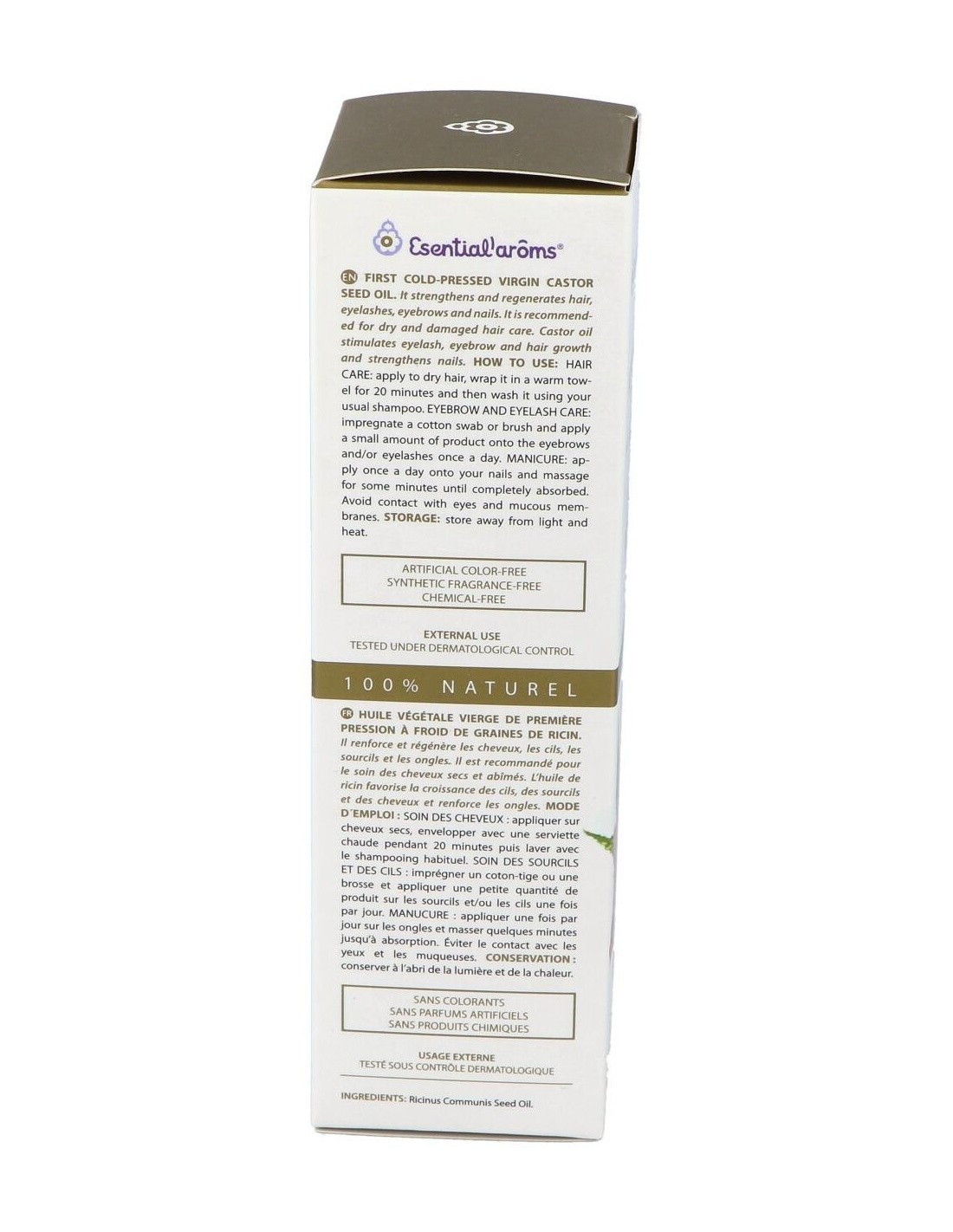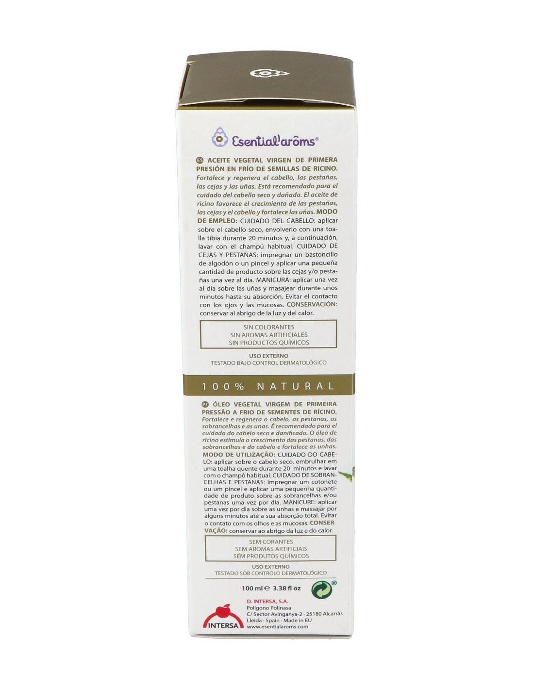 Ingredientes:Aceite vegetal virgen de semilla de ricino (Ricinus Communis). Aceite vegetal virgen extra obtenido sólo mediante procedimientos mecánicos.Modo de empleo:Puede aplicarse directamente para la hidratación corporal de niños y adultos. Puede utilizarse también en sinergia con otros aceites vegetales, para la creación de fórmulas.Presentación:Envase de 100 ml.Recomendaciones y advertencias:No contiene parabenos, parafina, sulfatos ni productos químicos. Producto cosmético. Uso externo. Testado bajo control dermatológico.
