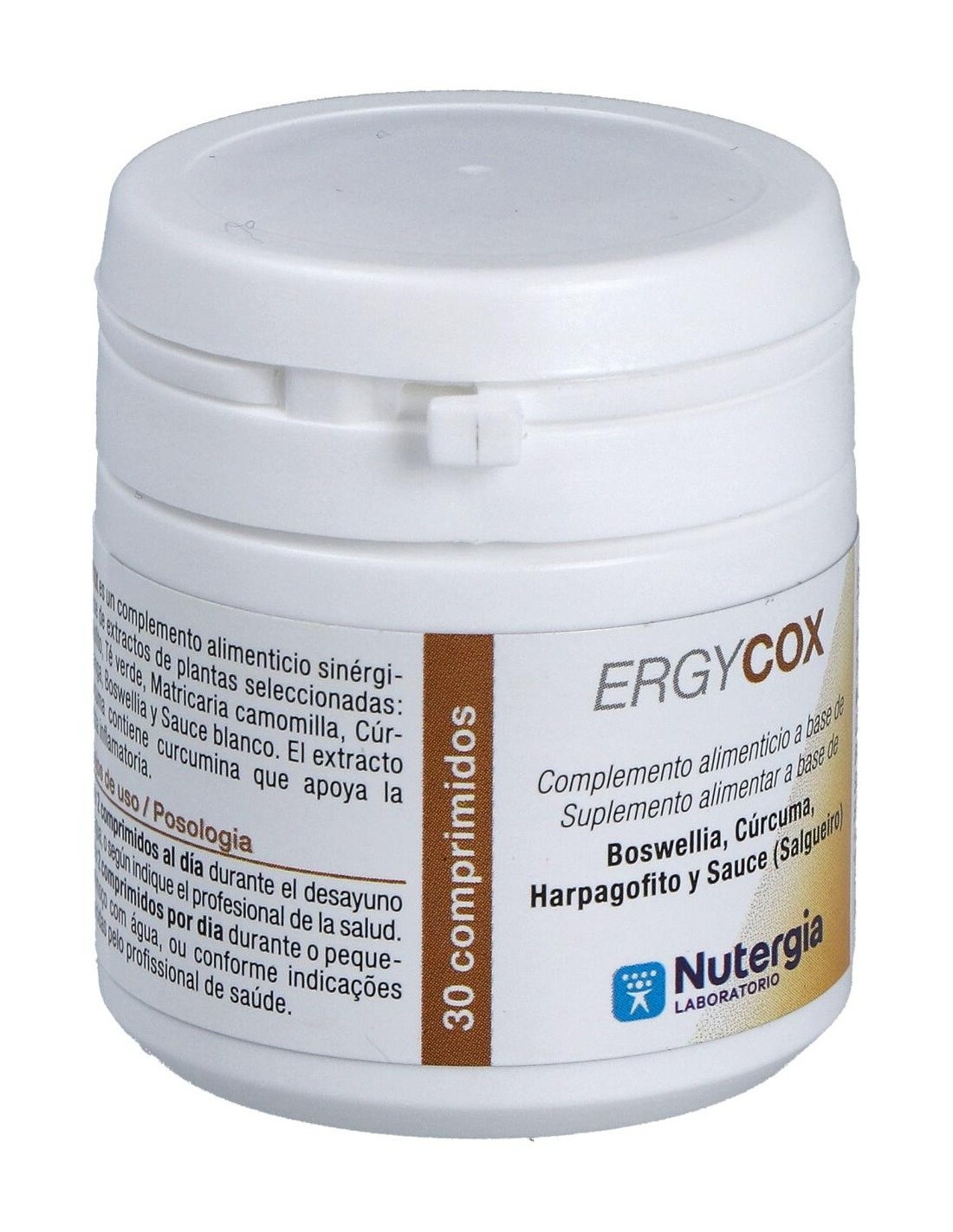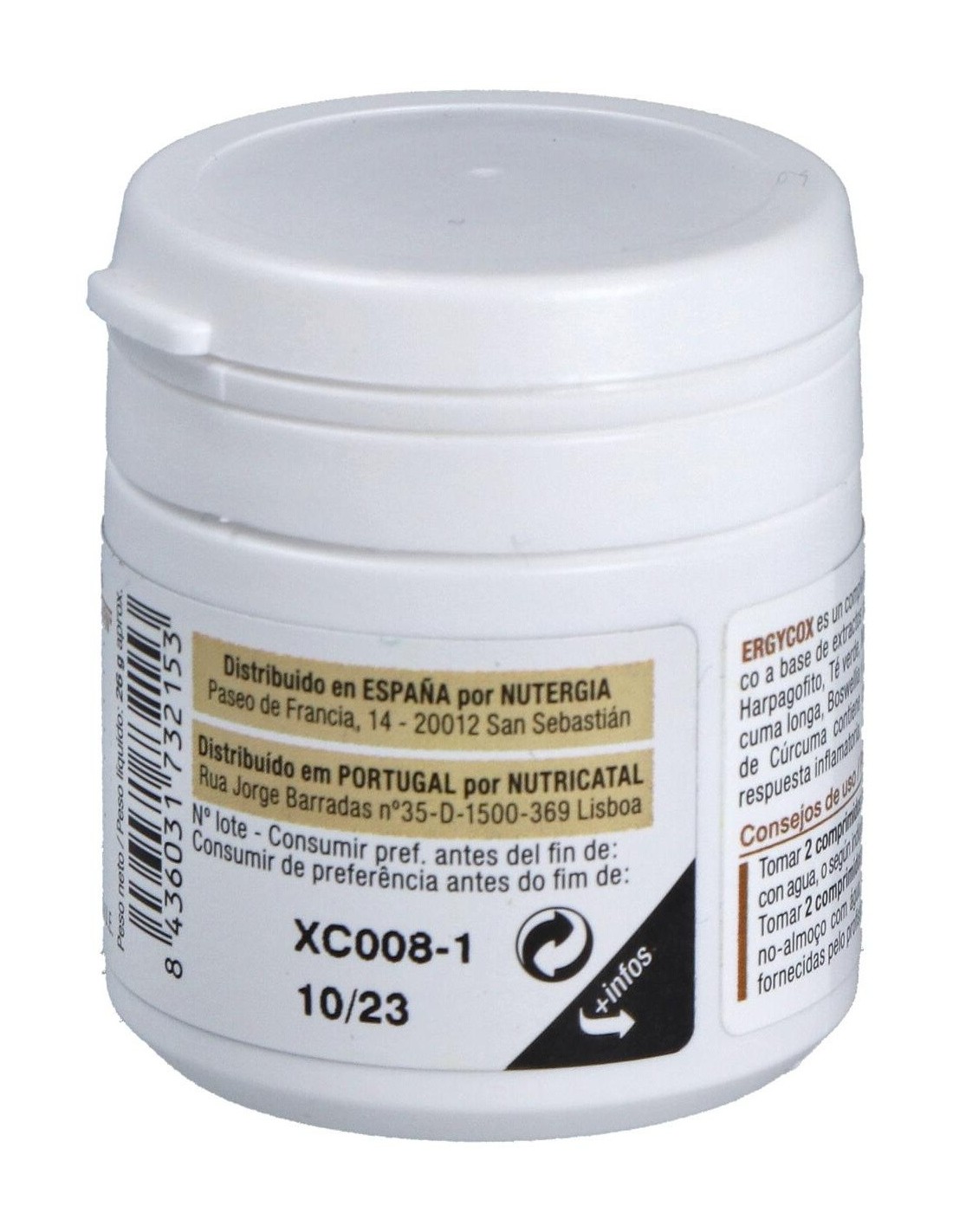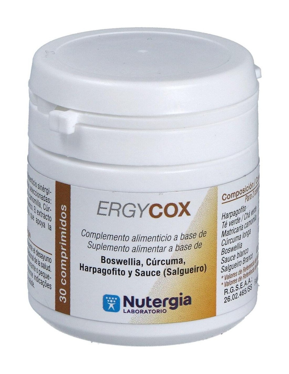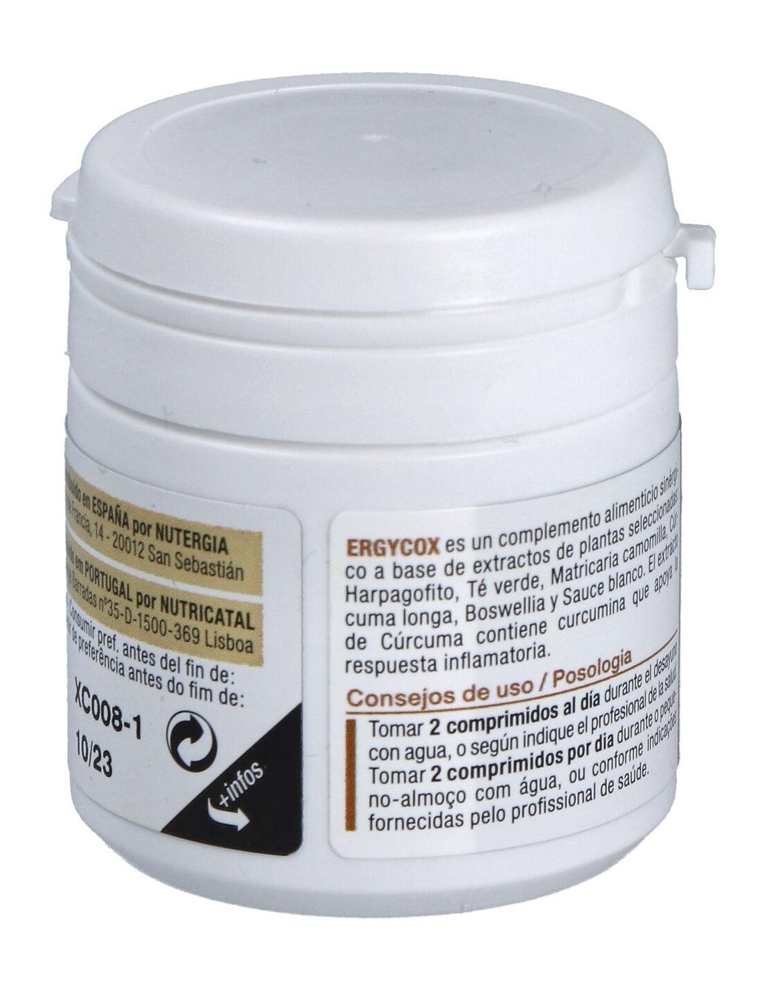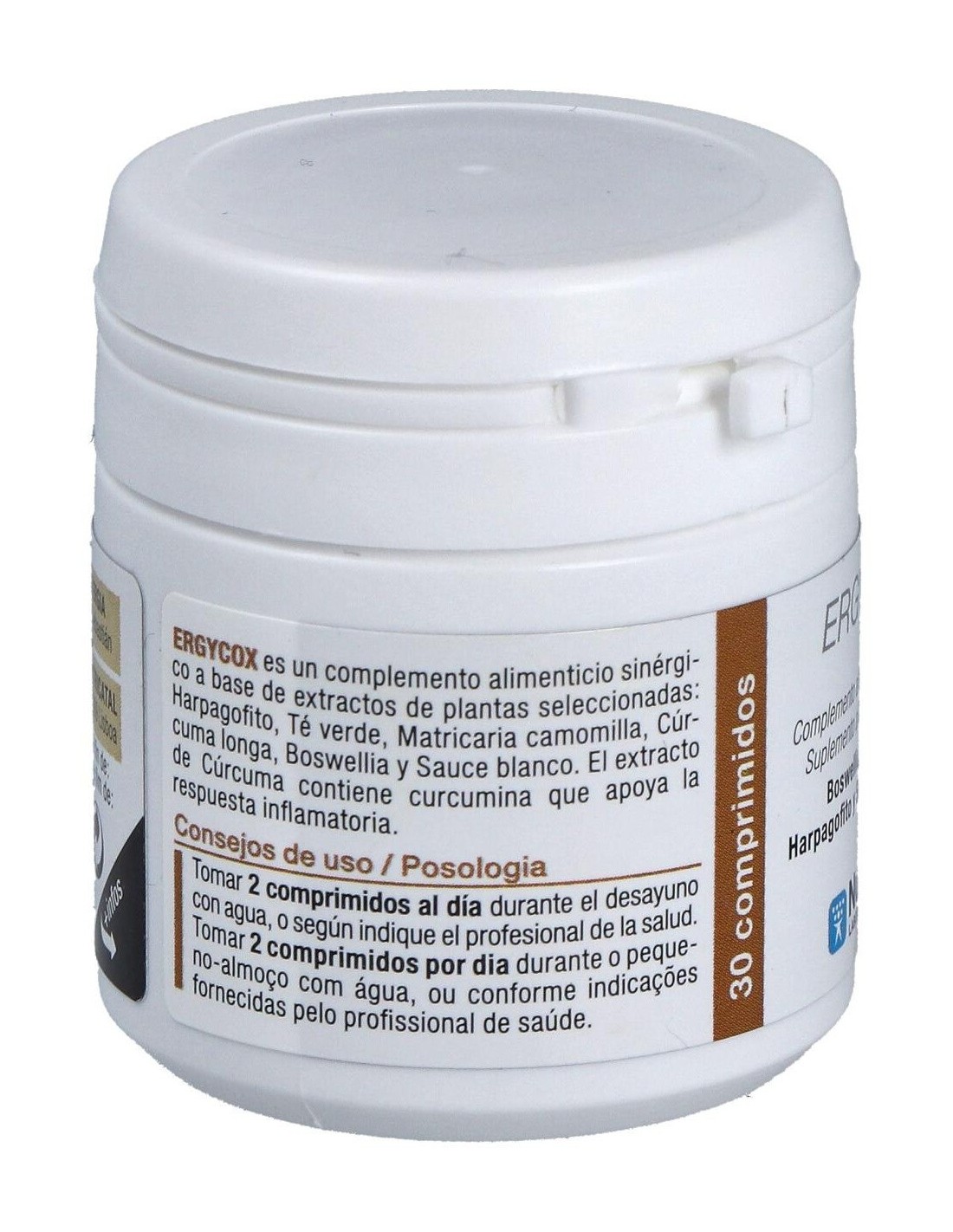 Extracto seco de Harpagofito (Harpagophytum procumbens (Burch.) DC., 2% Harpagosidos), celulosa microscristalina y fosfato bicálcico dihidratado, extracto seco de Té verde (Camellia sinensis (L.) Kuntze, 95% polifenoles, 70% catequinas, 40% EGCG (Epigalocatequina-3-Galato), extracto seco de Matricaria camomilla (Matricaria recutita L., 1% flavonas), extracto seco de Cúrcuma longa (Curcuma longa L., 50% curcuminoides), extracto seco de Boswellia (Boswellia serrata Roxb. Ex Colebr, 10% ácidos boswélicos) y extracto seco de Sauce blanco (Salix alba L., 25% Salicina), estearato de magnesio y dióxido de silicio.