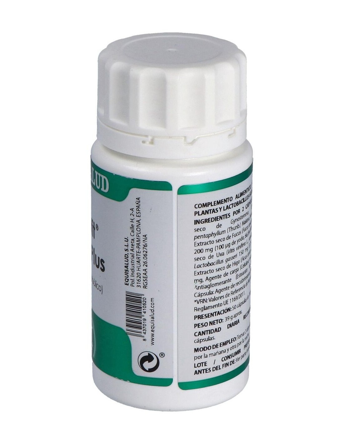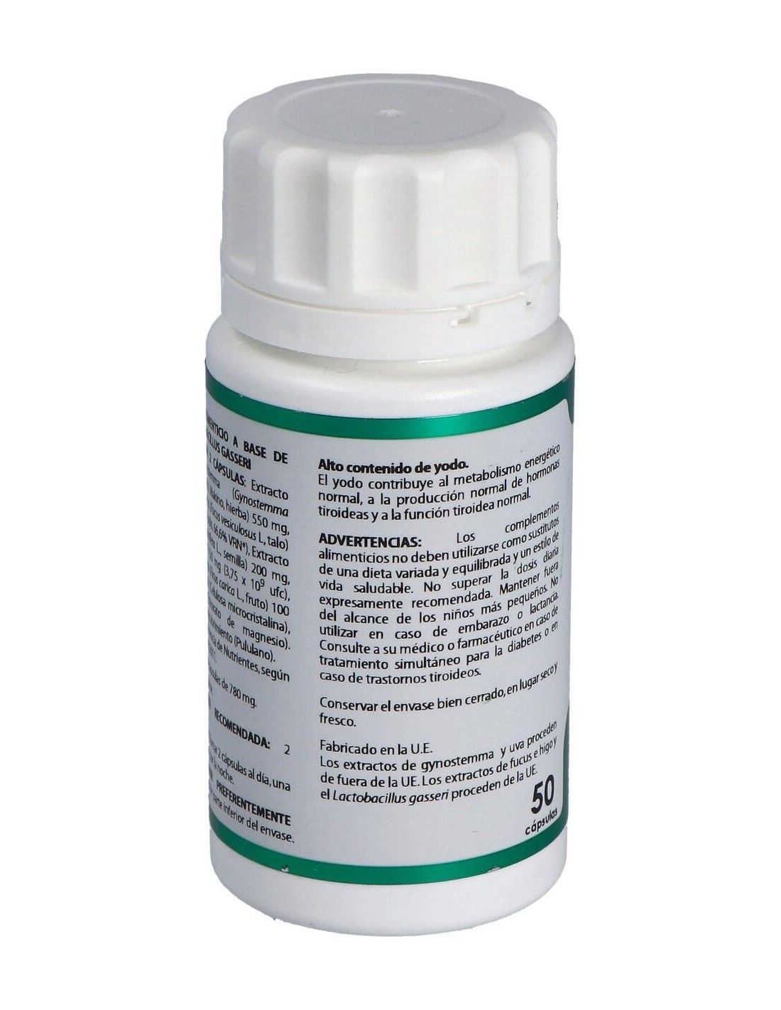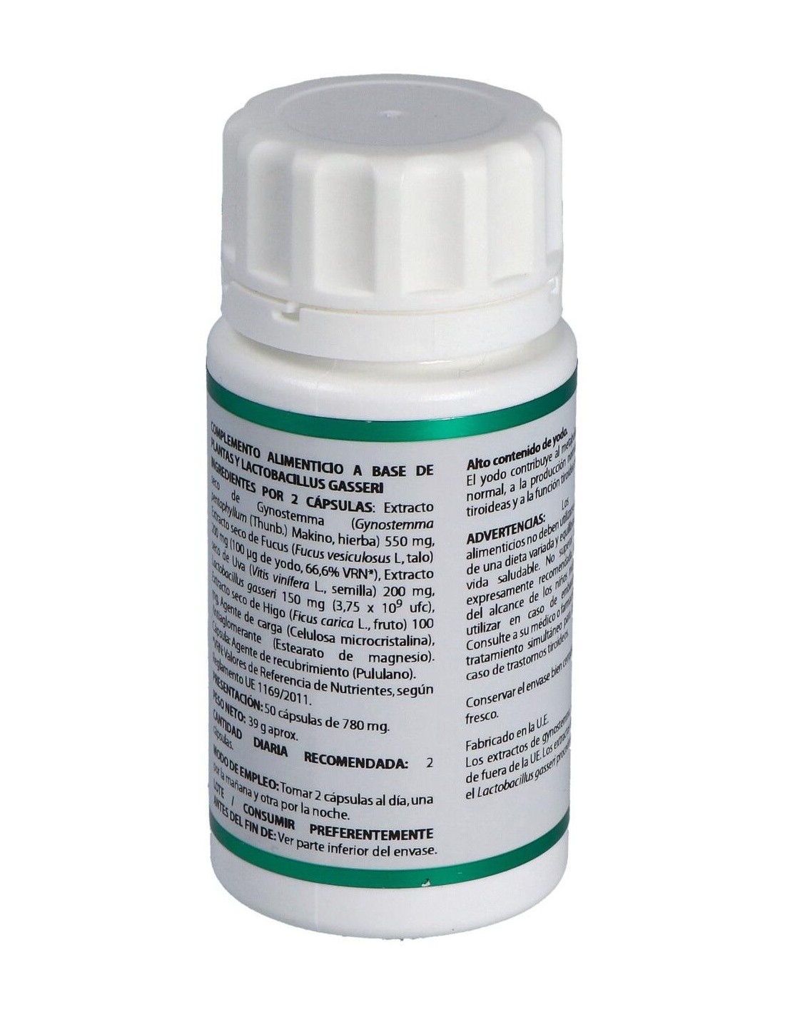 Jiaogulan* extracto seco (Gynostemma pentaphyllum (Thunb.) Makino), 275 mg: fucus* extracto seco (Fucus vesiculosus L.), 100 mg: uva* (Vitis vinifera L.), 100 mg: Lactobacillus gasseri* (en maltodextrina de maíz, 2,5×10(10) UFC/g), 75 mg: higo* (Ficus carica L.), 50 mg. Envoltura: polisacárido de origen vegetal (pululano).