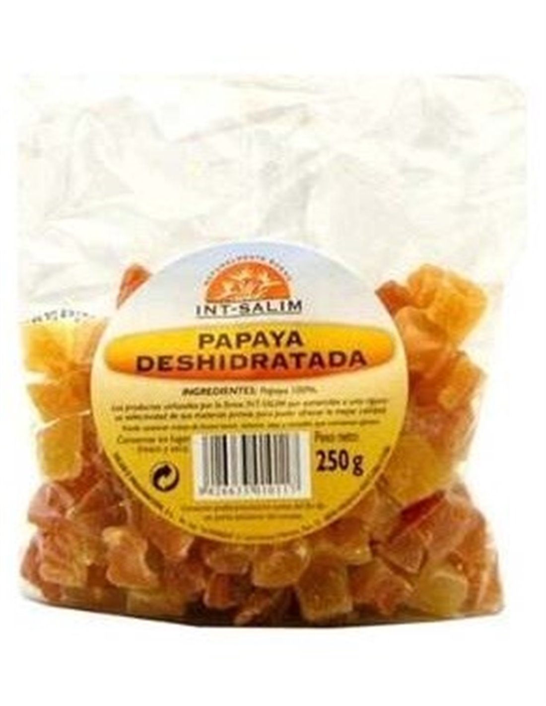 Delicia de origen vegetal de la marca Int-Salim. Producto elaborado únicamente con fruta natural, sometida a un riguroso proceso de deshidratación. No contiene conservantes. La papaya es un fruto especialmente recomendado para aliviar los problemas de estreñimiento debido a sus efectos en la optimización de la correcta función intestinal. Además, ayuda a prevenir la aparición de parásitos. Ofrece una función antiparasitaria, que colabora en la protección del organismo. Su consumo después de las comidas favorece el trámite de las digestiones pesadas facilitando este proceso. Entre sus componentes también está presente el betacaroteno, un pigmento natural rico en vitamina A que destaca por su aporte en el correcto cuidado de la piel.