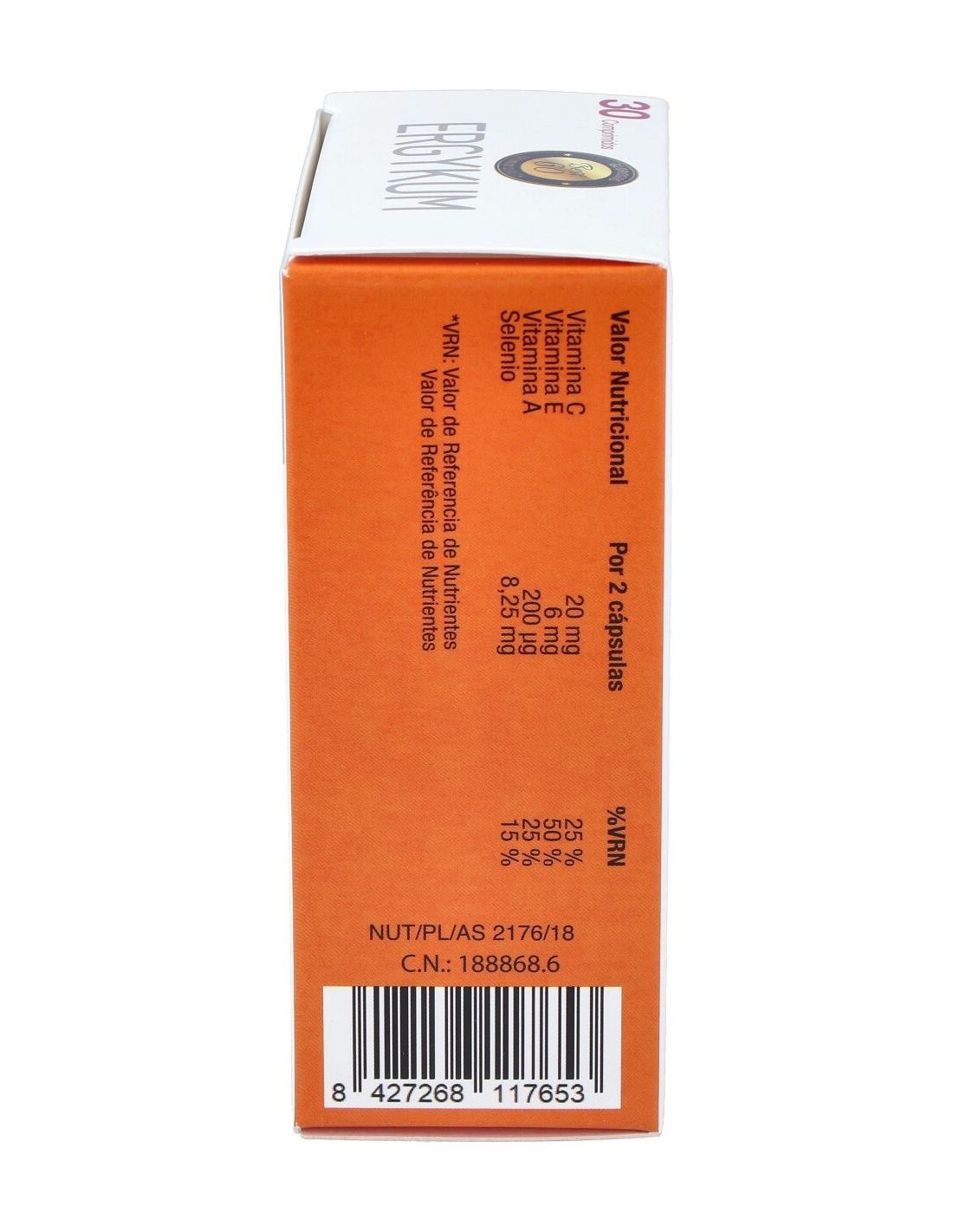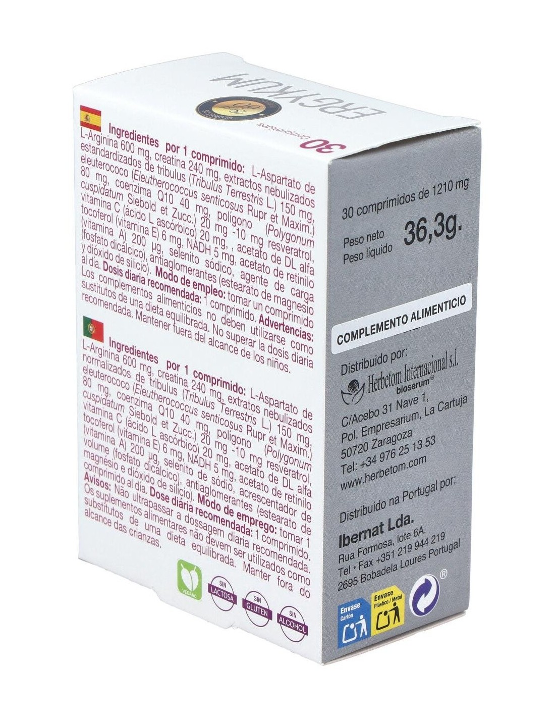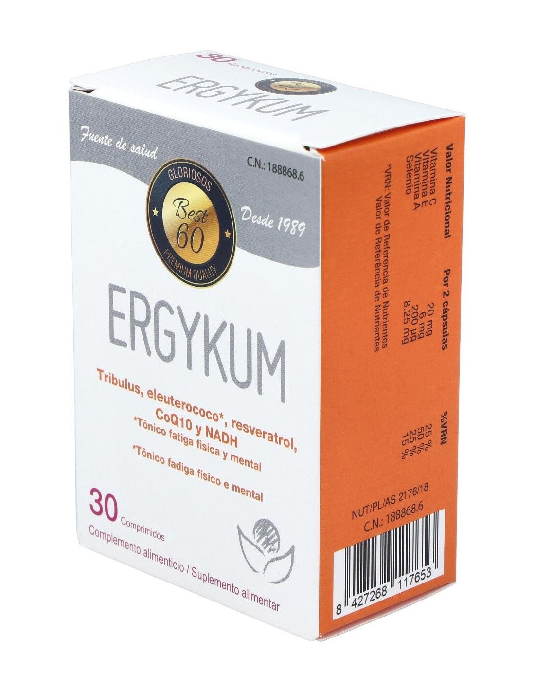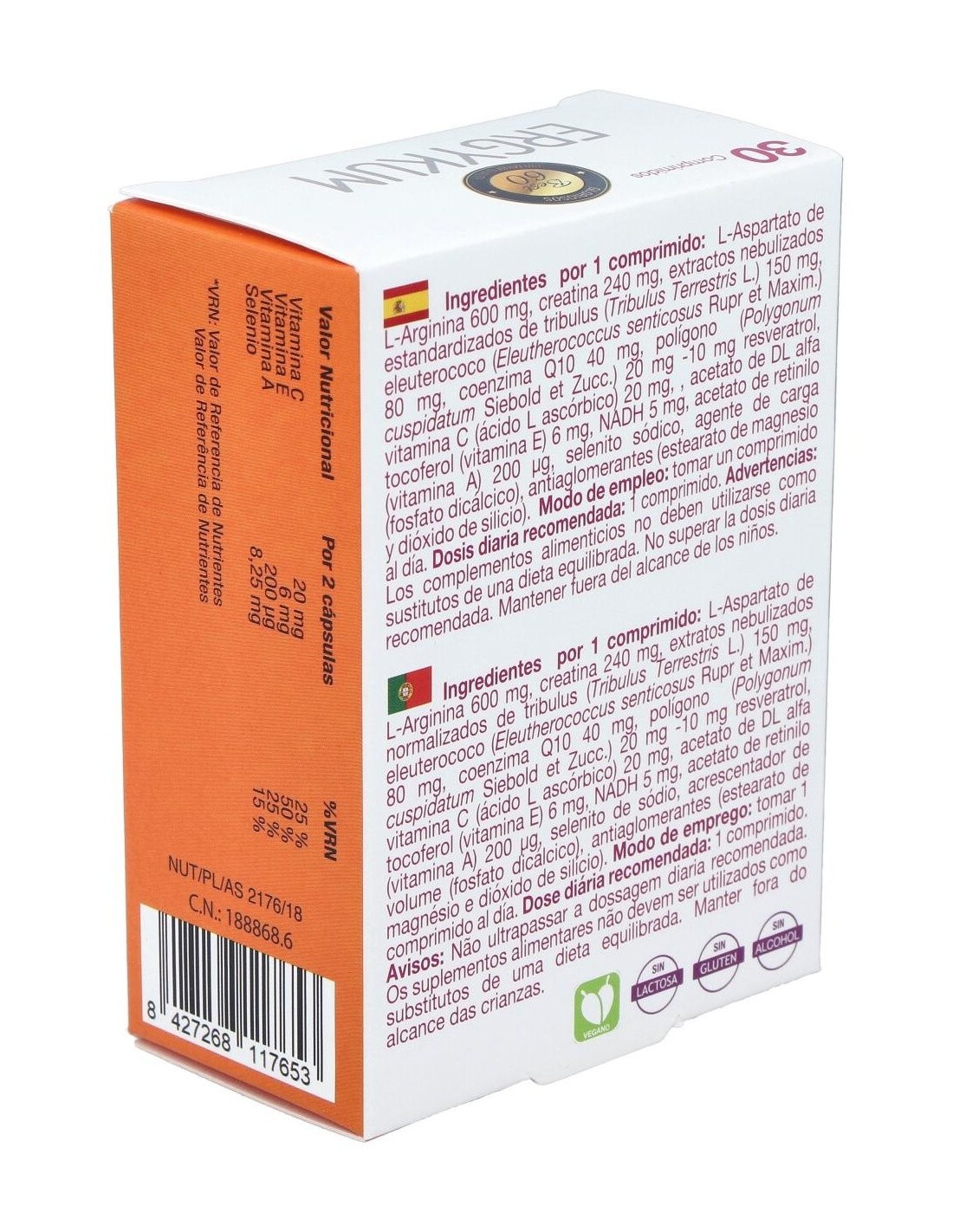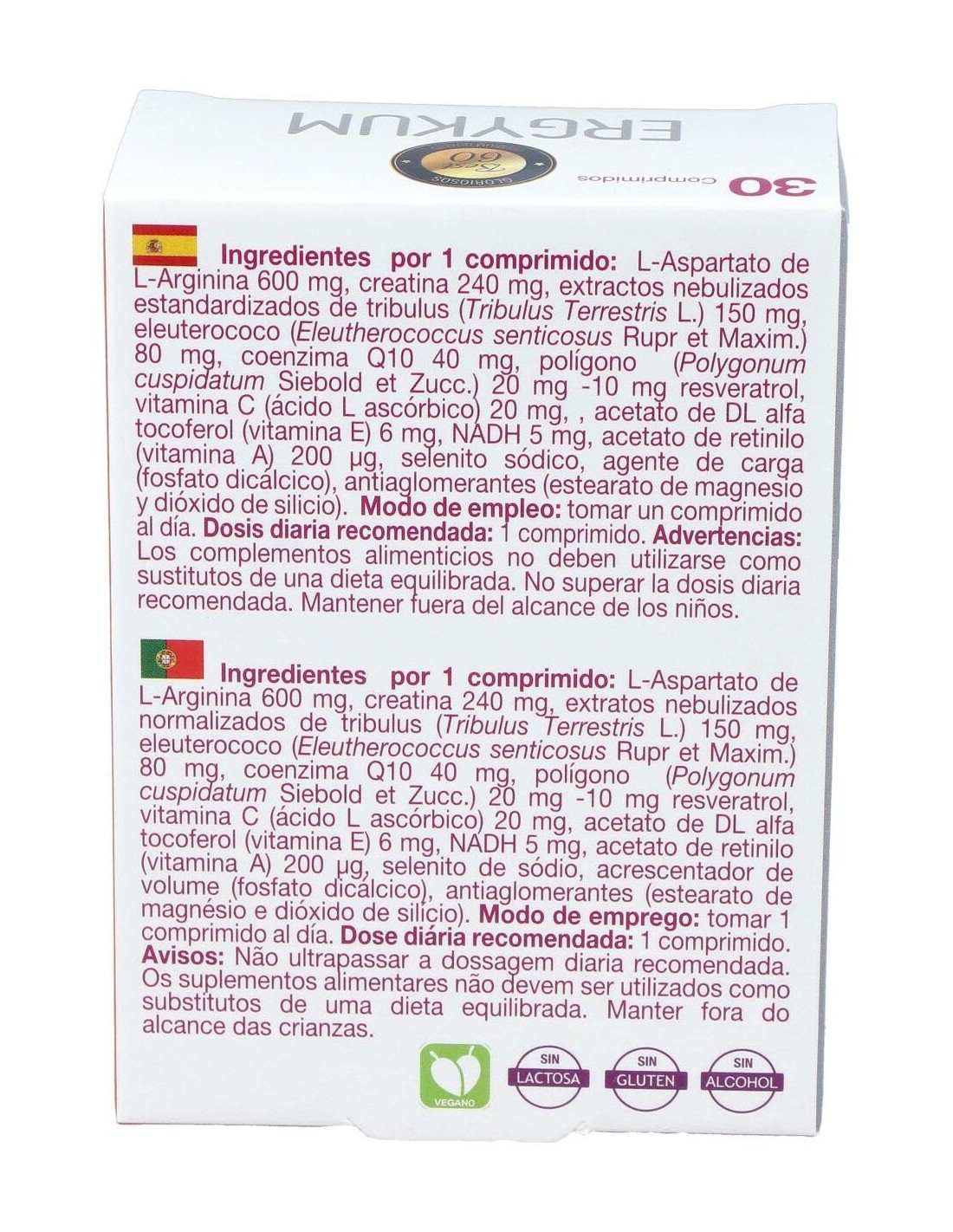 L-Aspartato De Arginina (600 Mg), Creatina (240 Mg), Extracto Nebulizado De: Tribulus Terrestres (150 Mg), Eleuthercoccus Senticosus (80 Mg), Coenzima Q10 (40 Mg), Polygonum Cuspidatum (20 Mg) (10 Mg Resveratrol), Vitamina C (20 Mg) (25% Vrn*), Vitamina E (6 Mg) (50% Vrn*), Nadh (5 Mg), Vitamina A (200 ?g) (25% Vrn*), 8,25 ?g (15% Vrn*).