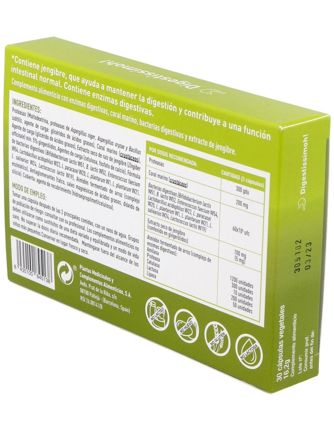 Ingredientes:Proteasas (Maltodextrina, proteasas de Aspergillus niger, Aspergillus oryzae y Bacillus subtilis, agente de carga: glicéridos de ácidos grasos), Coral marino (crustáceos). Agente de carga (glicérido de ácidos grasos), Extracto seco de raíz de jengibre (Zingiber officinale) min. 5% gingerólidos, Agentes de carga (celulosa, fosfato de calcio), Fórmula de bacterias digestivas (Bifidobacterium lactis W51, B. lactis W52, Enterococcus faecium W54, Lactobacillus acidophilus W22, L. paracasei W20, L. plantarum W1, L. plantarum W21, L. salivarius W24, Lactococcus lactis W19), Almidón fermentado de arroz (complejo enzimático), Antiaglomerantes (talco, sales magnésicas de ácidos grasos, dióxido de silicio). Cubierta: agente de recubrimiento (hidroxipropilmetilcelulosa).Modo de empleo:Tomar 1 cápsulas después de las principales comidas, con un vaso de agua.Presentación:Envase de 30 cápsulas.Recomendación y advertencias:No contiene gluten ni lactosa. Contie pescado.