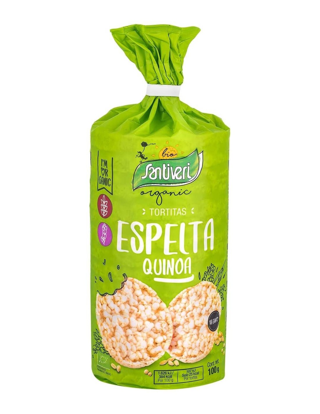 Tortitas de espelta y quinoa elaboradas con ingredientes de calidad procedentes de la agricultura ecológica. Pueden ser utilizadas como sustitutos del pan en desayunos, comidas, meriendas o para picar entre horas. Son una fuente importante de proteínas y de fibra. No contienen lactosa ni azúcar. Producto vegano.