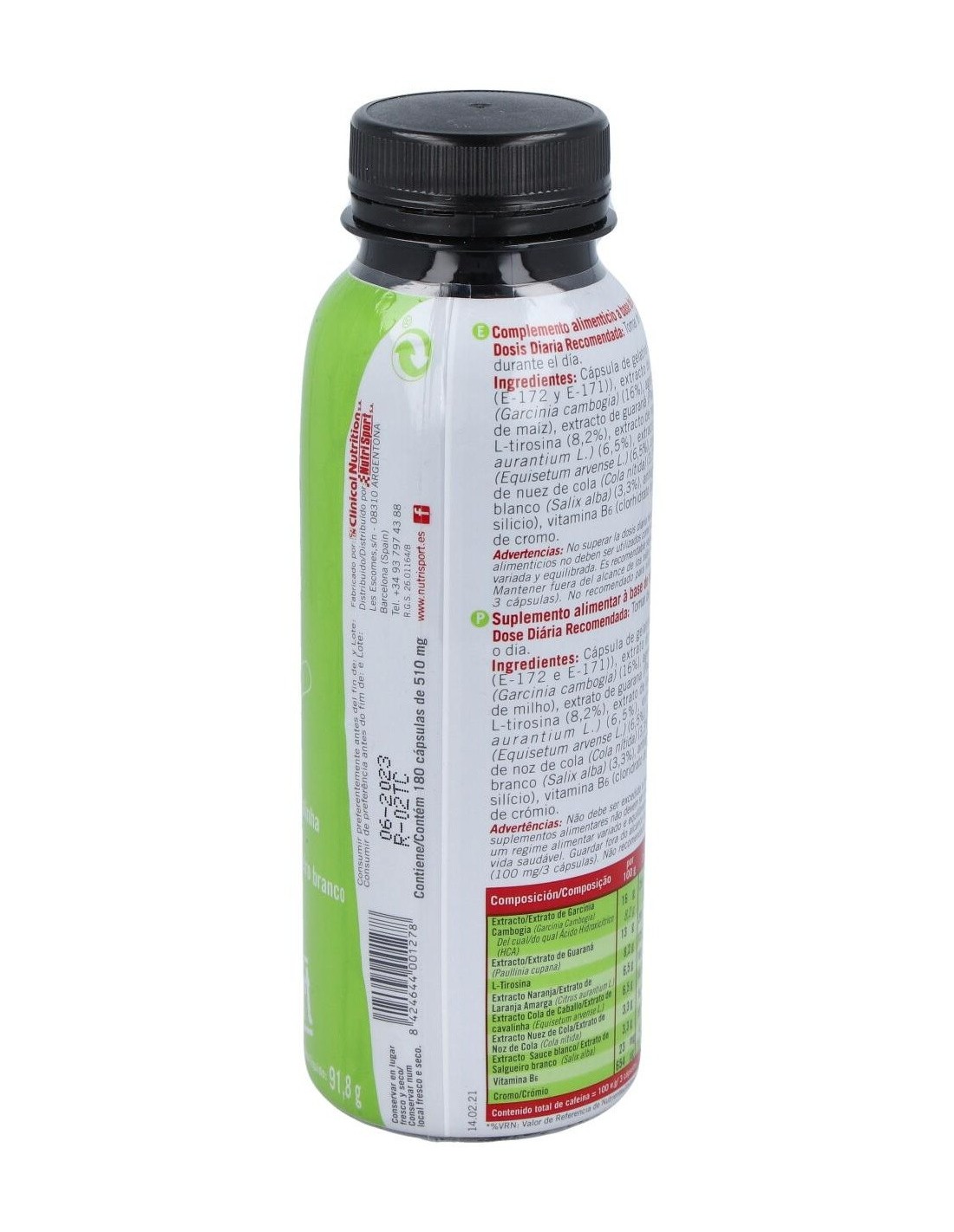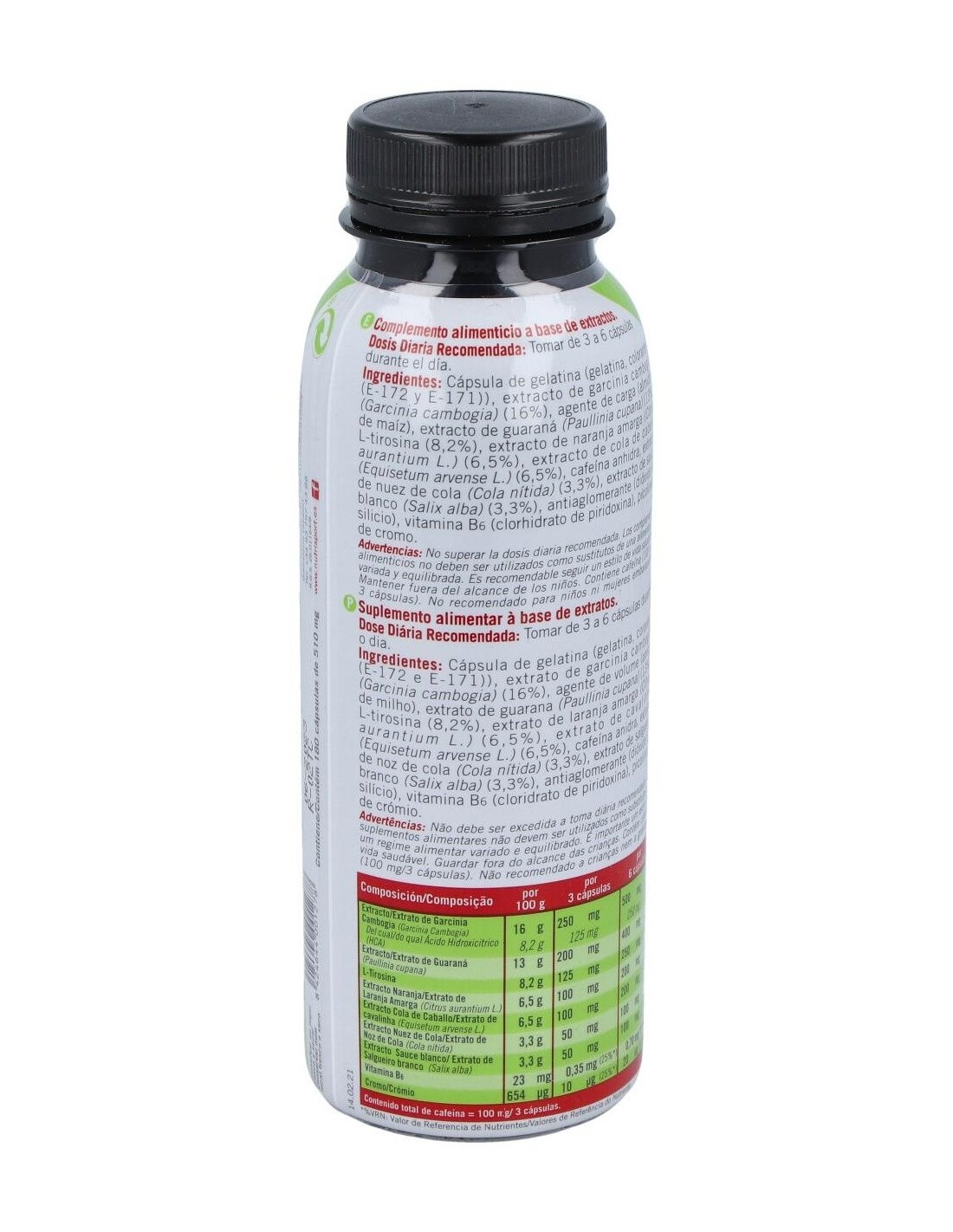 Extracto de garcinia cambogia (250 mg), Extracto de Guaraná (200 mg), Acido hidroxicitrico (150 mg), L-Tirosina (125 mg), Extracto de Cola de Caballo (100 mg), Extracto de Naranja Amarga (100 mg), Extracto de nuez de cola (50 mg), Extracto de sauce blanco (50 mg), Cromo (10 µg), Vitamina B6 (0.35 mg).