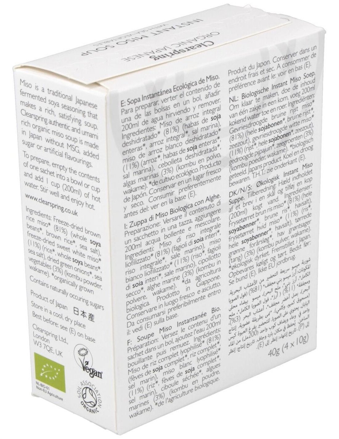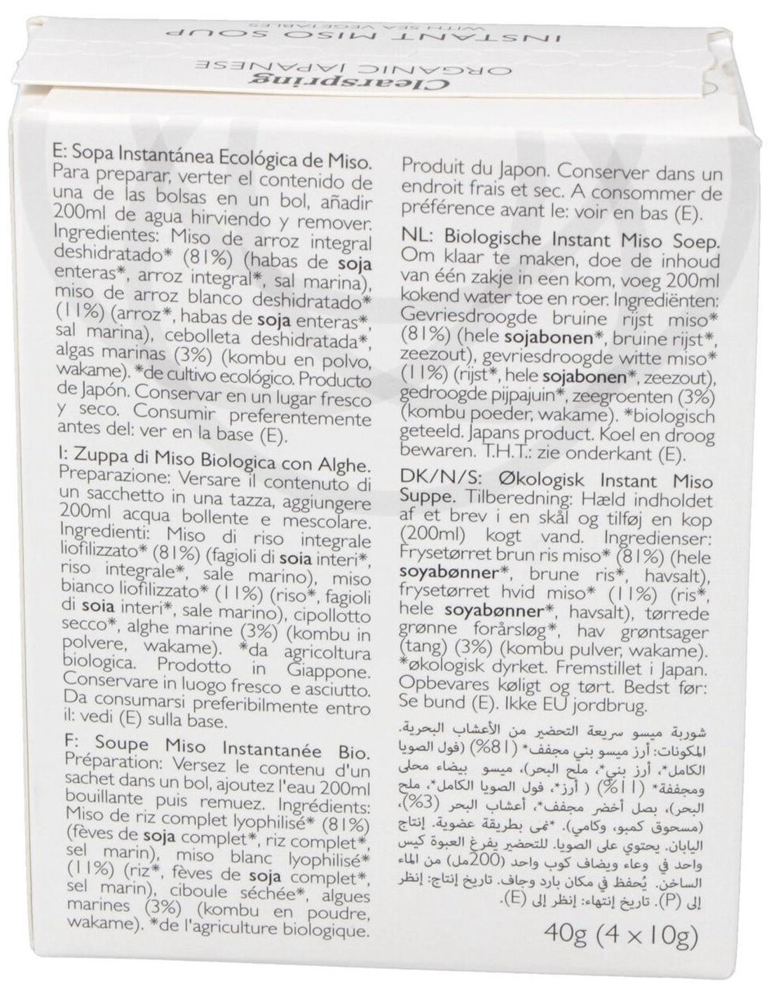 Miso de arroz integral liofilizado * (81%) ( habas de soja enteras *, arroz integral *, sal marina), miso blanco dulce liofilizado * (11%) (arroz *, habas de soja enteras *, sal marina) , cebollas verdes secas *, algas marinas (3%) (kombu en polvo, wakame).