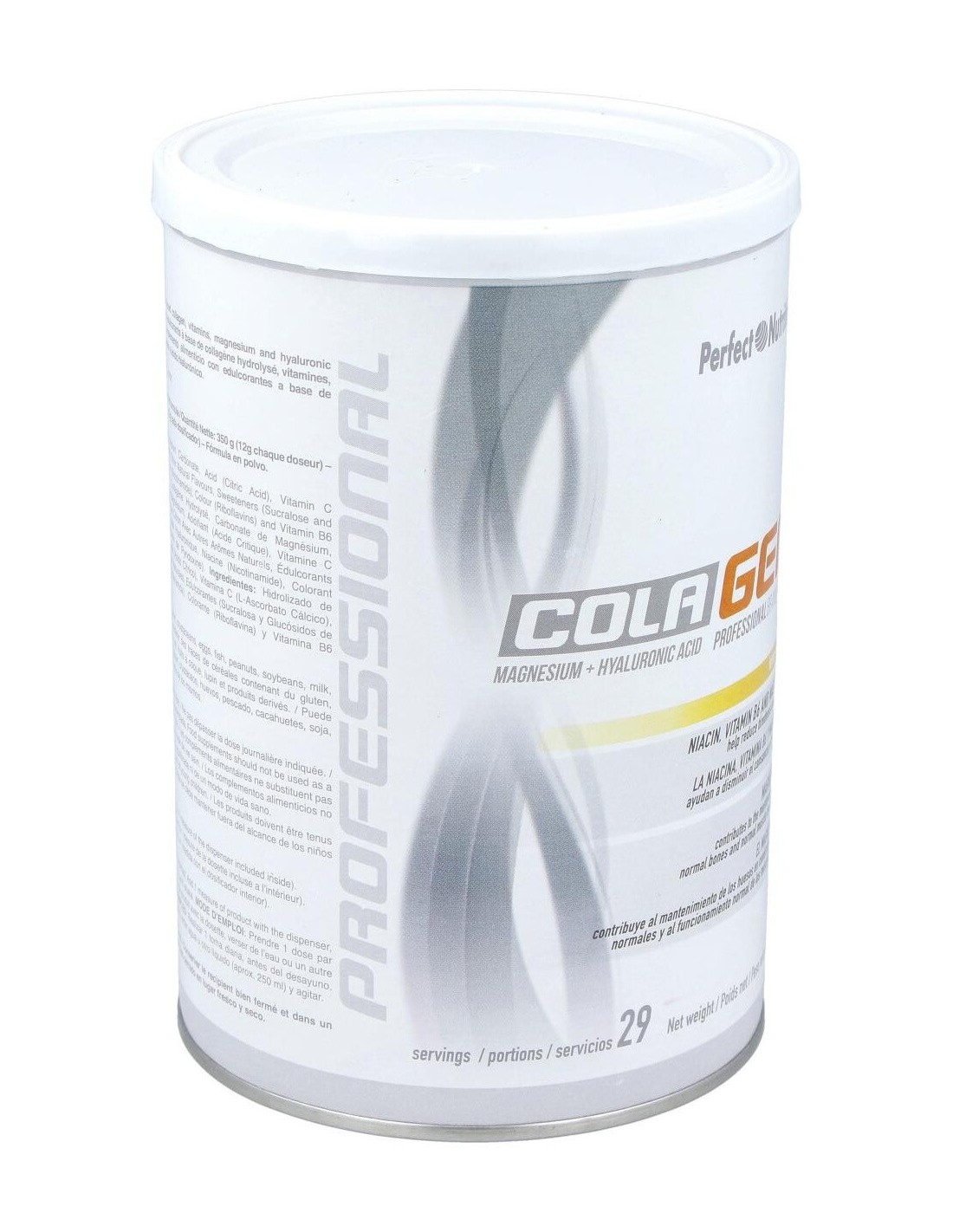 Hidrolizado de Colágeno, Carbonato Magnésico, Acidulante (Ácido Cítrico), Vitamina C (L-Ascorbato Cálcico), Aroma Natural de Limón con Otros Aromas Naturales, Edulcorantes (Sucralosa y Glucósidos de Esteviol), Ácido Hialurónico, Vitamina B3 (Nicotinamida), Colorante (Riboflavina) y Vitamina B6 (Piridoxina Clorhidrato).