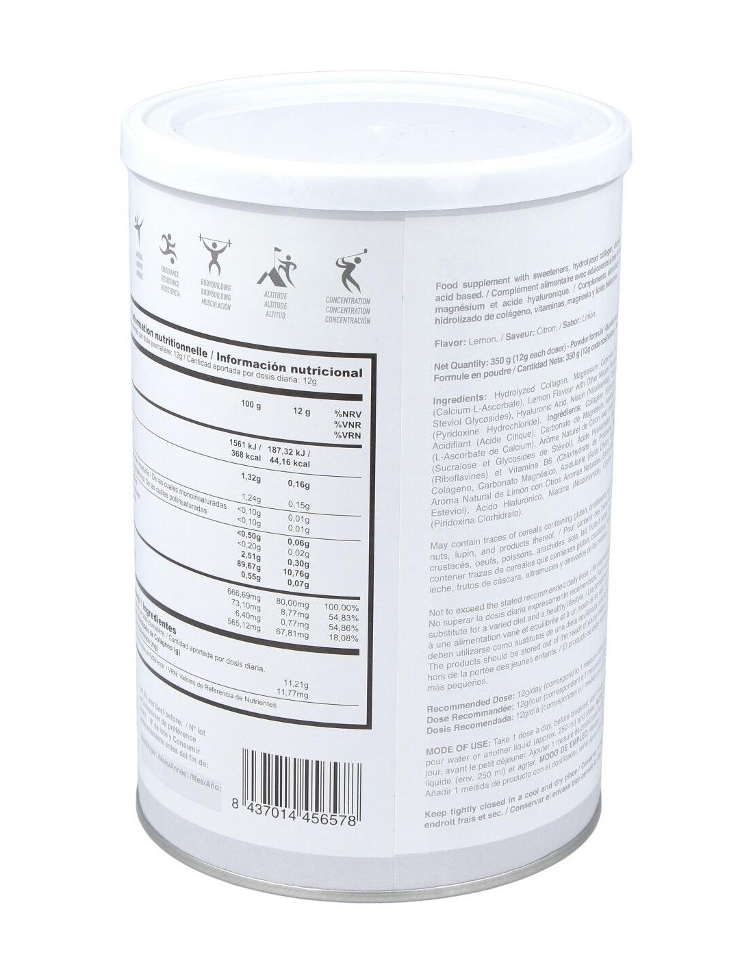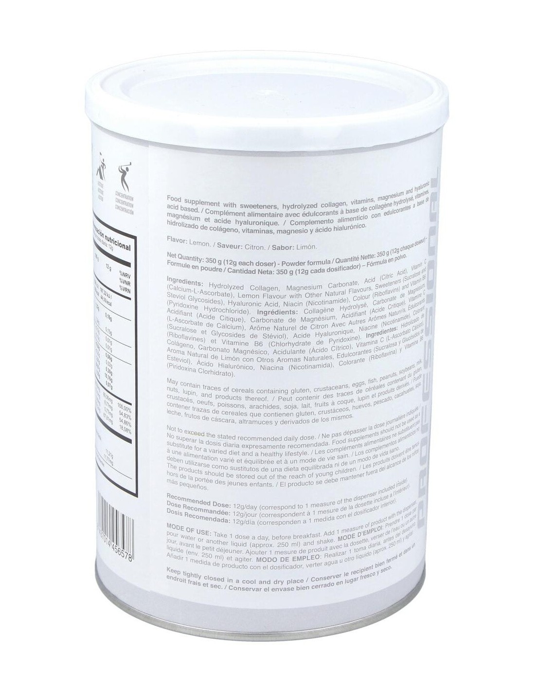Complemento alimenticio en forma de polvos solubles y con sabor a limón, que contribuye al mantenimiento normal de los huesos y de la masa muscular, aportando colágeno de forma natural a tendones, ligamentos, articulaciones y piel.