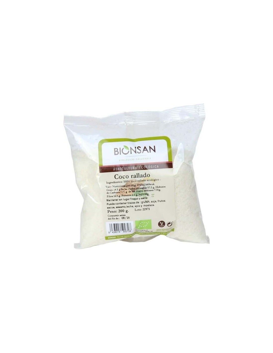 100% coco rallado ecológico. Valor nutricional por 100 g: Energía: 2761KJ/660Kcal, Proteína: 6.8 g., Grasa: 64.5 g. De las cuales saturadas: 57.2 g. Hidratos de carbono: 7.3 g. De los cuales azúcares: 7.3 g, Sal: 0.009 g. *Puede contener trazas de gluten, soja, frutos secos, sésamo, leche, apio y mostaza.