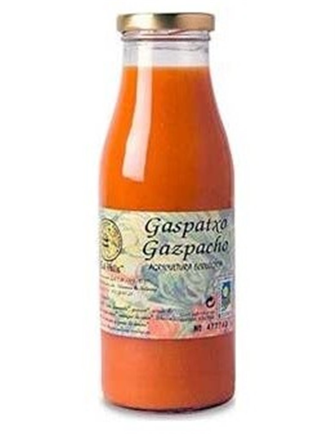 Tomate, Pepino, Pimiento, Cebolla, Aceite de oliva virgen extra, Vinagre de vino, Ajo, Zumo de limón y Sal marina. Todos productos provenientes de la agricultura ecológica.