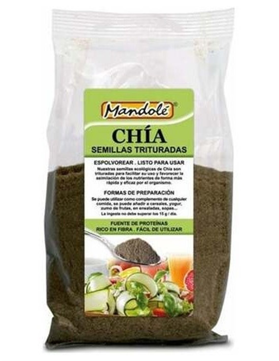Semillas trituradas de chía con certificado verde que garantiza que es un producto de orígen biológico y procedente de la agricultura ecológica. Puede contener trazas de frutos de cáscara y gluten. Es rica en antioxidantes y produce rápidamente un estado de saciedad.