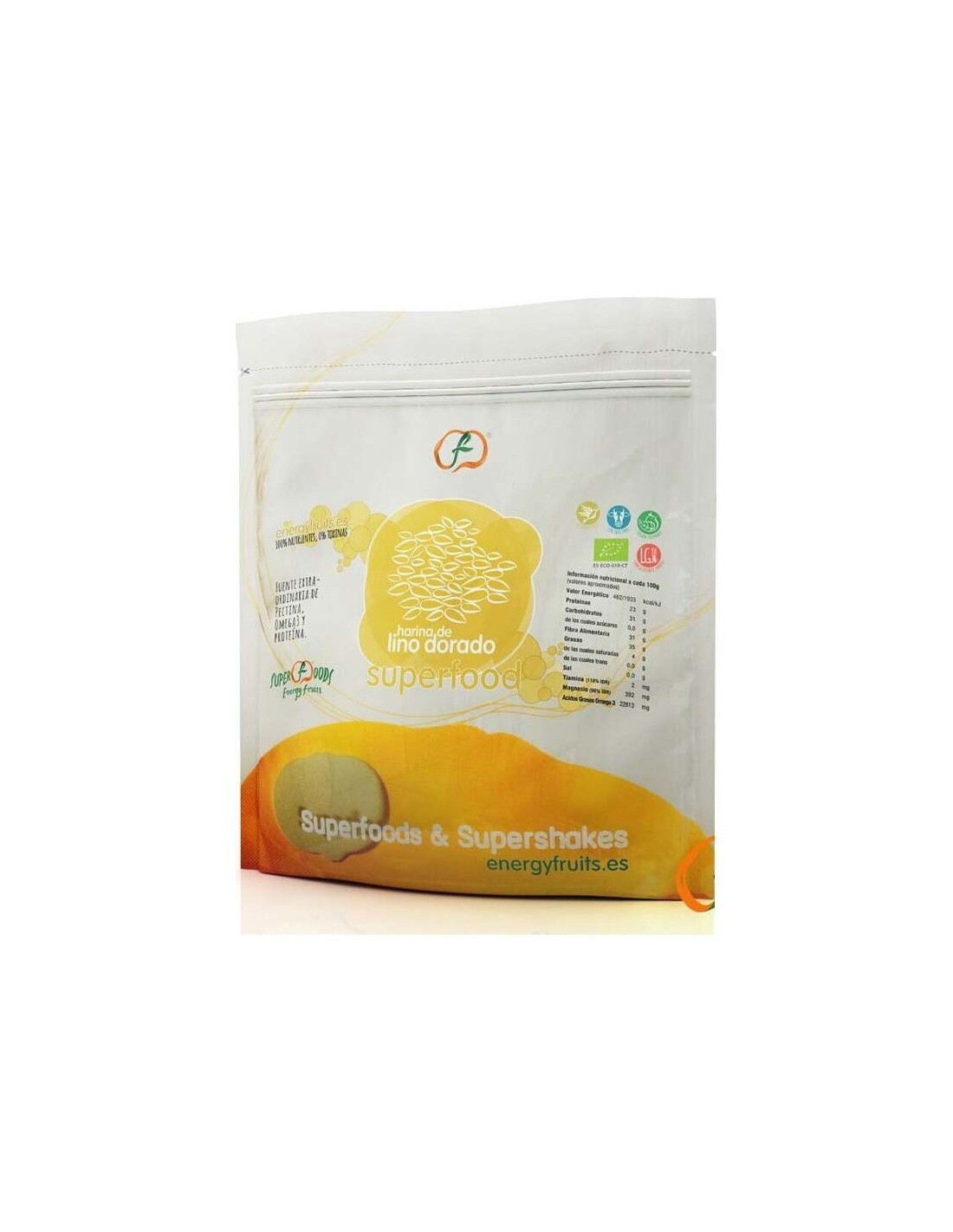 Harina de lino dorado (Linum usitatissium) ecológico. \ \ Valor nutricional por 100 g:\ Valor energético (kcal/kJ) 462/1933\ Proteínas (g) 23\ Carbohidratos (g) 31\ de los cuales azúcares (g) 0,0\ Fibra alimentaria (g) 31\ Grasas (g) 35\ de las cuales saturadas (g) 4\ de las cuales trans (g) 0,0\ Sal (g) 0,0