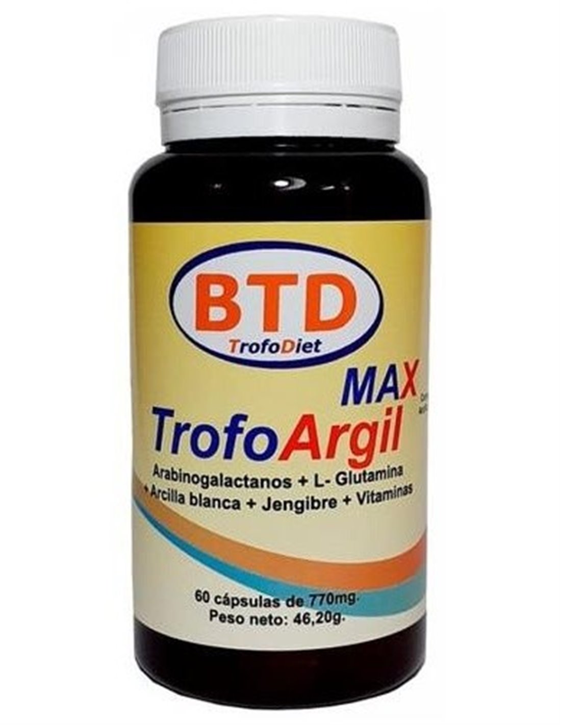 Arabinogalactanos polvo 100 mg\ L-Glutamina polvo 100 mg\ Alga Chlorella polvo 75 mg\ Fenogreco-Alhova Ext. Seco 60 mg\ Kaolin, Arcilla blanca dietética 60 mg\ MSM polvo 50 mg\ Jengibre, Ext. seco 50 mg\ Soja fermentada Soynatto.. 40 mg\ Pectina de Manzana polvo 40 mg\ Quercetina polvo 25 mg\ Propóleo, Ext. seco 25 mg\ Lactobacillus acidophilus LR-1... 10 mg\ Zinc................................................. 5 mg\ Vitamina B6................................... 1 mg\ Vitamina B2................................... 0,80 mg\ Vitamina A 0,50 mg