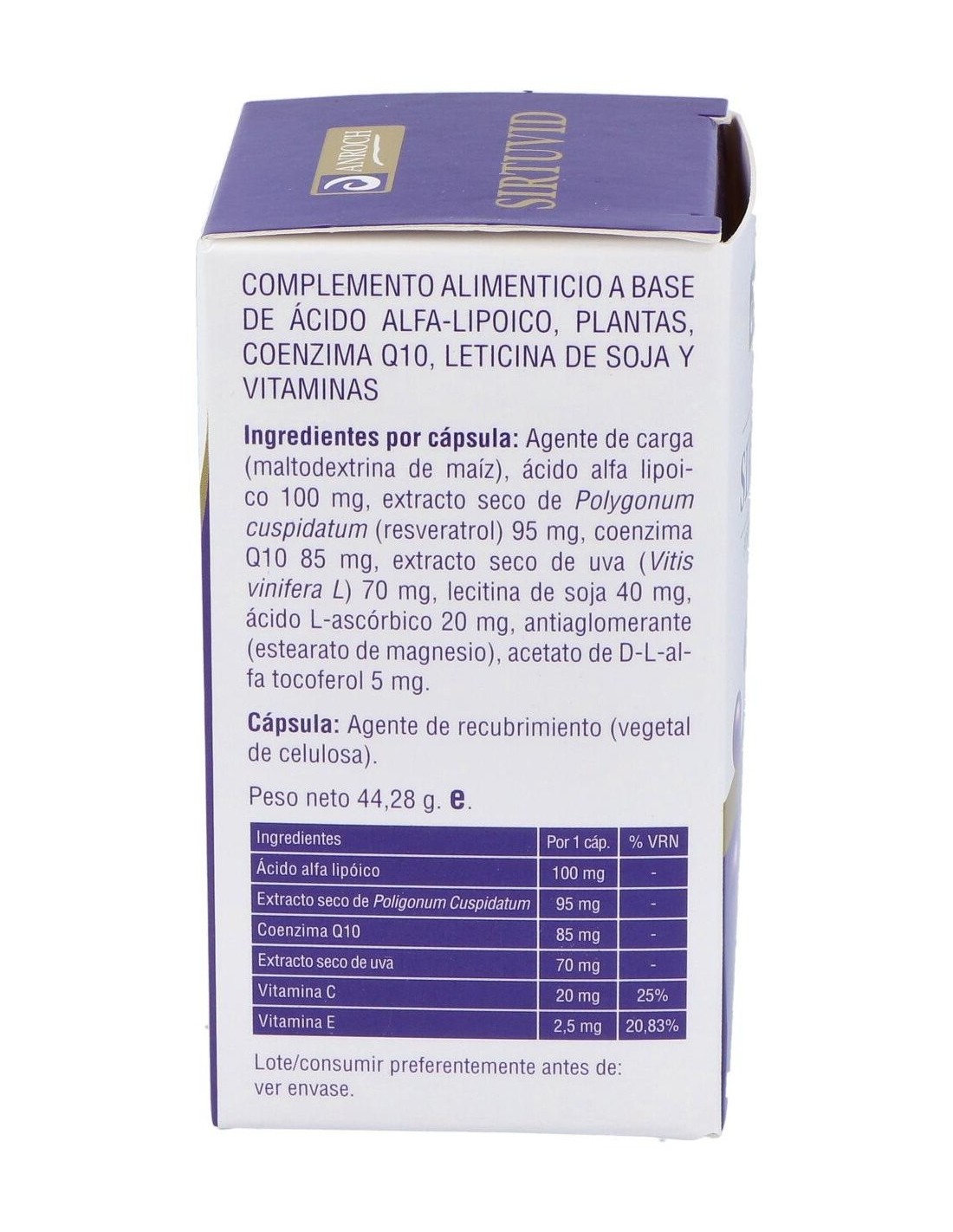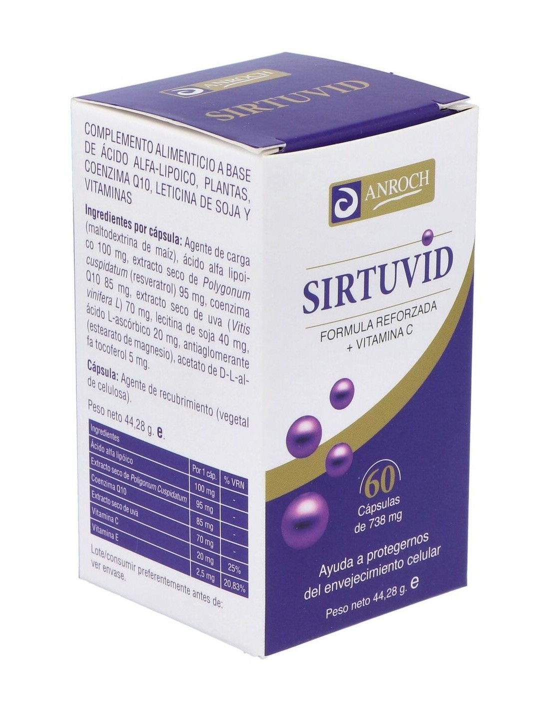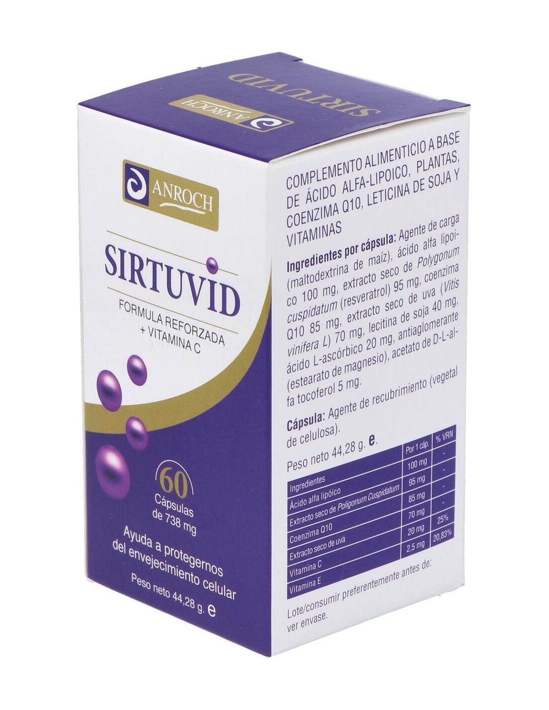 Complemento alimenticio que ayuda a la protección frente al envejecimiento celular, contribuyendo a la protección de las células frente al daño oxidativo. Formulado a base de ingredientes que actúan de forma positiva como antioxidante, rejuvenecedor que ayuda ante síntomas de envejecimiento. Contiene Resveratrol, Coenzima Q10, Ácido alfa lipoico y Vitamina E entre otros. Se recomienda en los síntomas que acompañan al síndrome de fatiga crónica física y mental, y en los síntomas de la fibromialgia. Formato 60 cápsulas.
