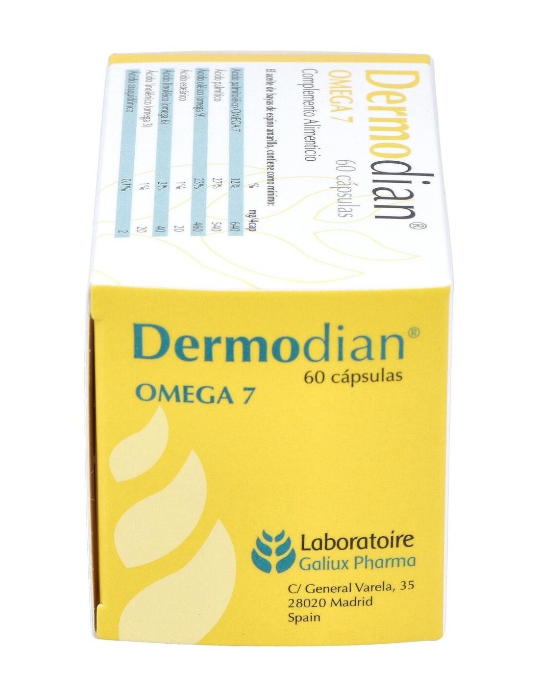 Dermodian omega 7 es un complemento alimenticio que favorece la función de los tejidos y mucosas. Gracias a su formulación cuida y protege la piel desde el interior.