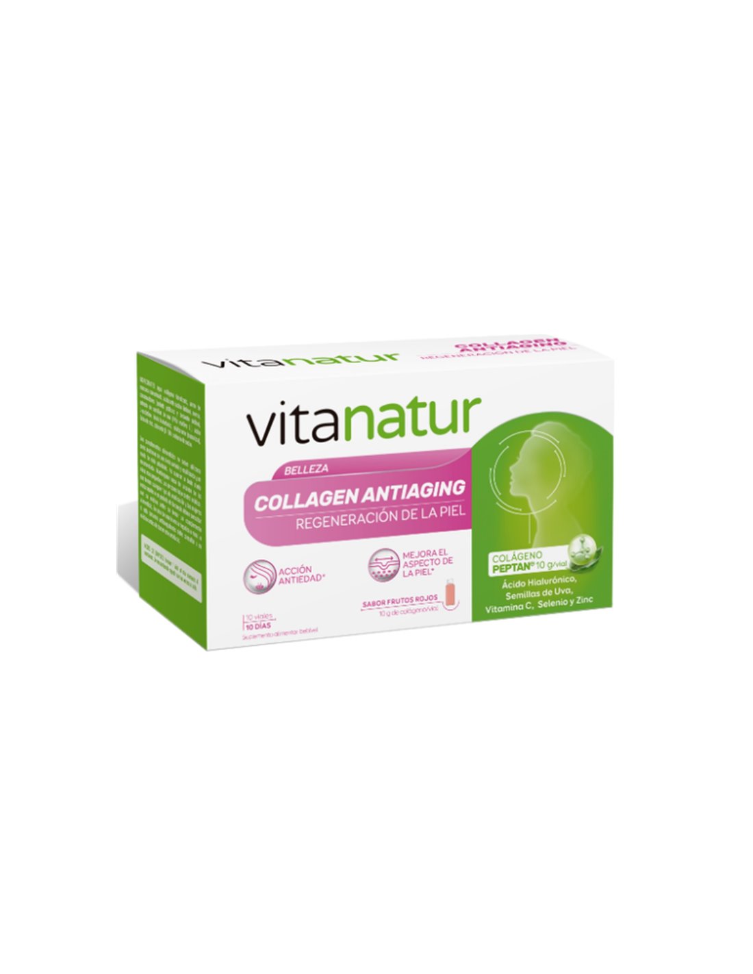 Vitanatur | Vitanatur Collagen Antiaging 10 VialesVitanatur Collagen Antiaging 10 Viales es un complemento alimenticio elaborado a base de colágeno hidrolizado Peptan y activos como el ácido hialurónico, óxido de zinc, selenito de sodio, zumo de manzana y extracto de semillas de uva. Su formulación antiedad ayuda a regenerar la piel, contribuye al mantenimiento de la piel en condiciones óptimas, protege las células frente al daño oxidativo y mejora el aspecto del cutis.