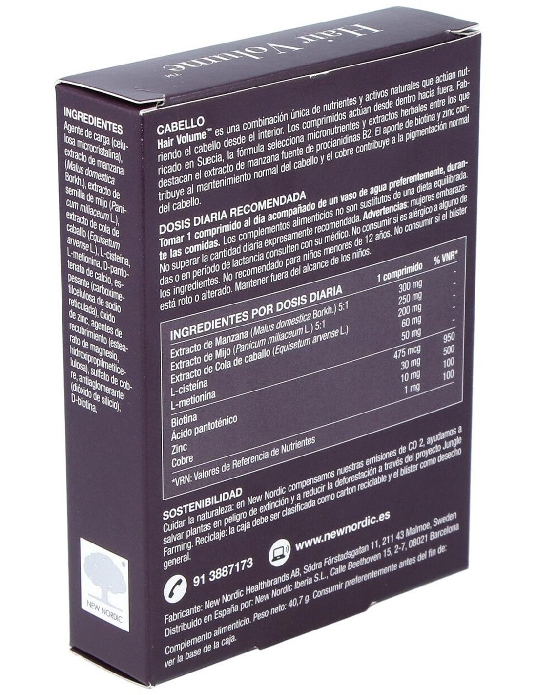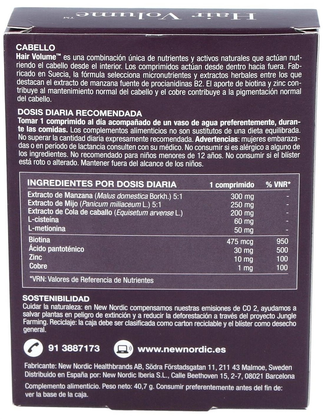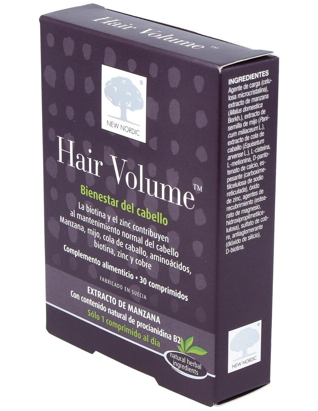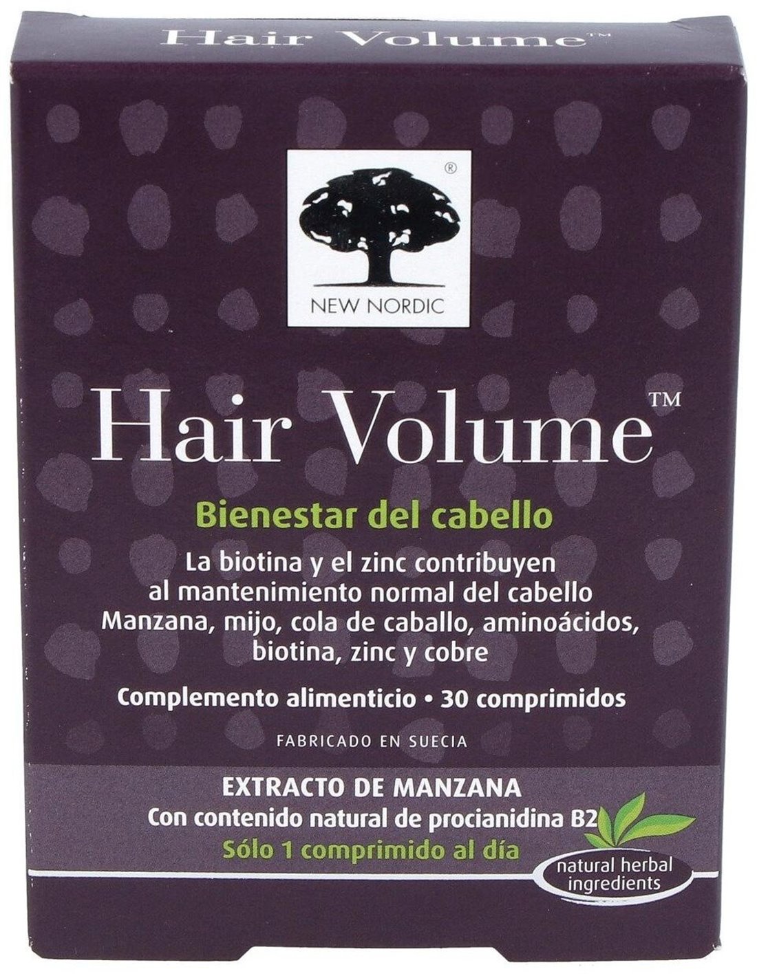 Suplemento alimenticio formulado con Escandinavia, extracto de manzana, procianidina B2 y cola de caballo. Producto destinado a facilitar el cuidado de la belleza del cabello, epidermis y uñas. Además, en la composición encontramos biotina y zinc contribuyen al crecimiento del cabello y el cobre contribuye a conservar la pigmentación normal, retrasando el blanqueamiento del cabello.
