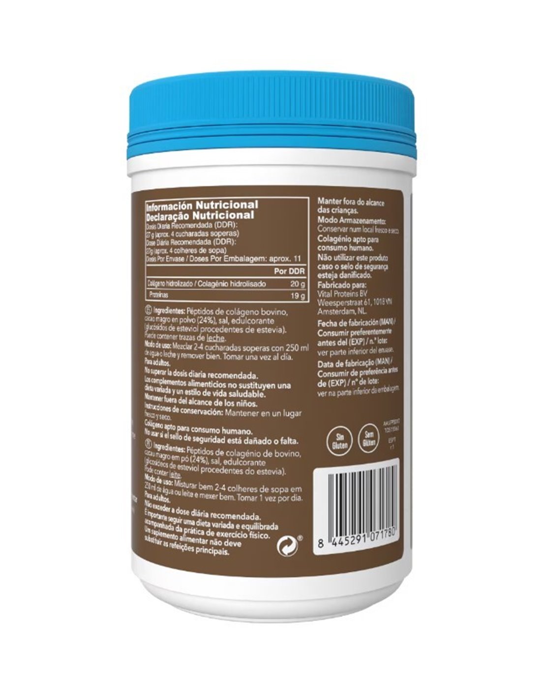 Ingredientes:Péptidos de colágeno bovino, cacao magro en polvo (24%), sal, edulcorante (glucósidos de esteviol procedentes de estevia).Modo de empleo:Mezclar 2-4 cucharadas soperas con 250 ml de agua o leche y remover bien.Presentación:Envase de 297 gramos.Recomendaciones y advertencias:No contiene gluten. Puede contener trazas de leche.