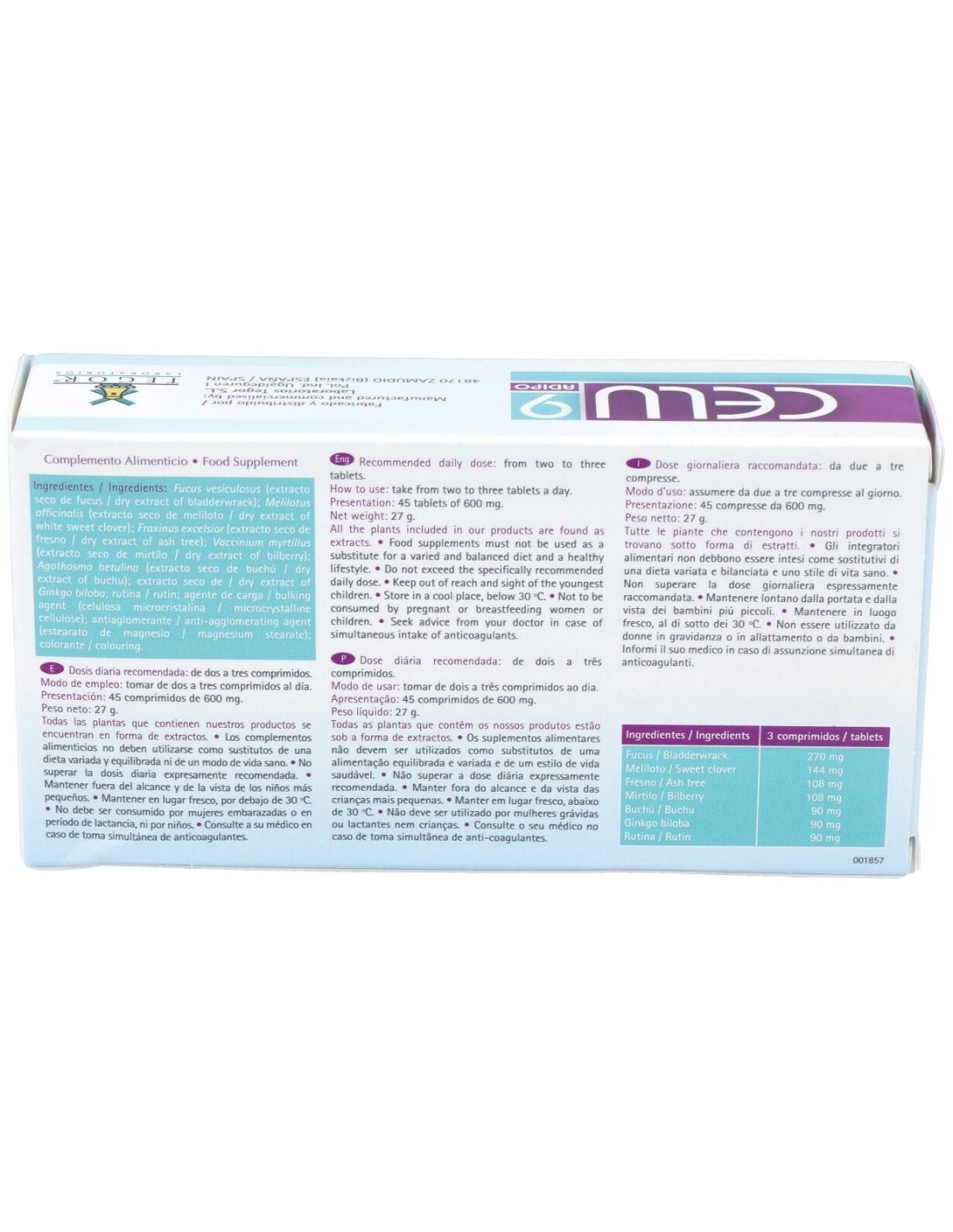 La celulitis es un problema mayoritariamente femenino debido a un estancamiento de líquidos localizado. La estudiada fórmula de los ingredientes de Celu 9 Adipo le confiere al producto la capacidad de poder ayudar en problemas de celulitis y exceso de volumen gracias a su triple acción: quemagrasas, drenante y circulatorio venoso y linfático. Composición por comprimido: