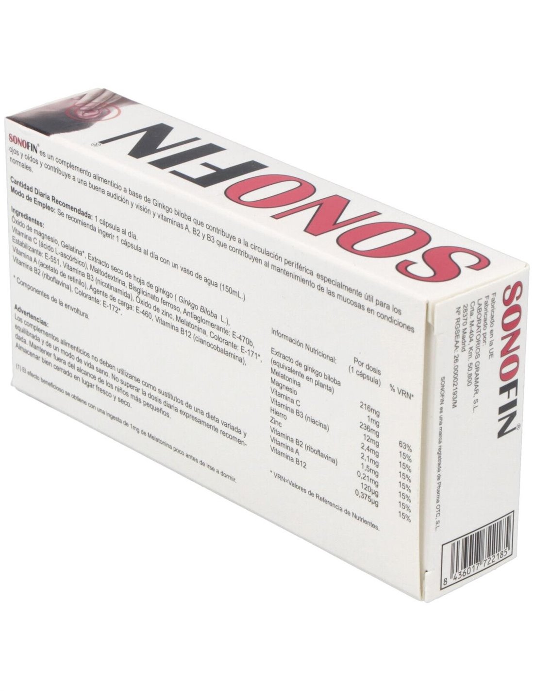 Ingredientes:Óxido de magnesio, Gelatina*, Extracto seco de hoja de ginkgo ( Ginkgo Biloba L.). Vitamina C (ácido L-ascórbico), Maltodextrina, Bisglicinato ferroso, Antiaglomerante: E-470b, Estabilizante: E-551, Vitamina B3 (nicotinamida), Óxido de zinc, Melatonina, Colorante: E-171* Vitamina A (acetato de retinilo), Agente de carga: E-460, Vitamina B12 (cianocobalamina), Vitamina B2 (riboflavina), Colorante: E-172*. (*) Componentes de la envoltura.Modo de empleo:Tomar 1 cápsula al día por la mañana. Presentación:Envase de 30 cápsulas.