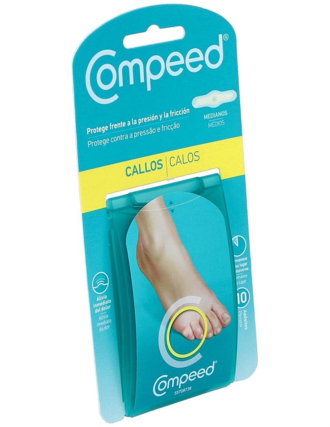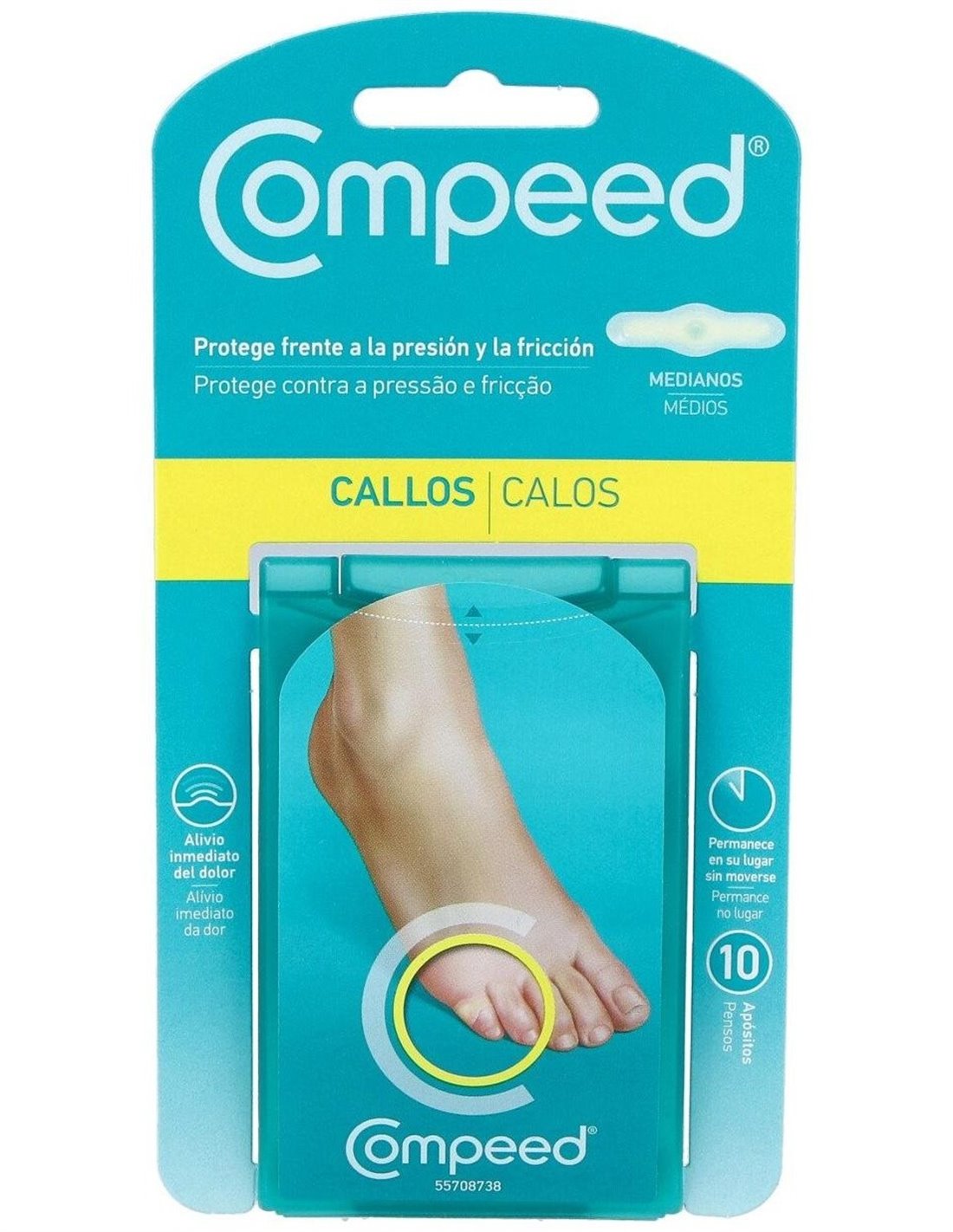 Compeed® callos hidrocoloide T- Medianos están específicamente preparados para aliviar y proteger de forma inmediata el dolor provocado por callos en la piel de los pies. Con un sérum hidratante suavizante incorporado, combinado con la última tecnología hidrocoloide, meojoran la sensación cutánea, suavizando y aliviando el dolor de la fricción.