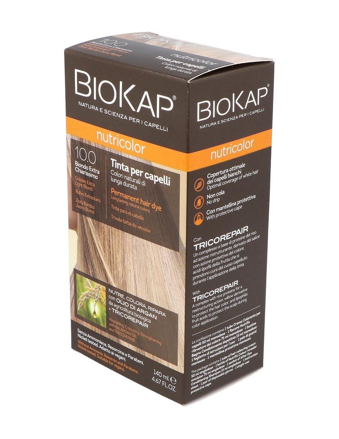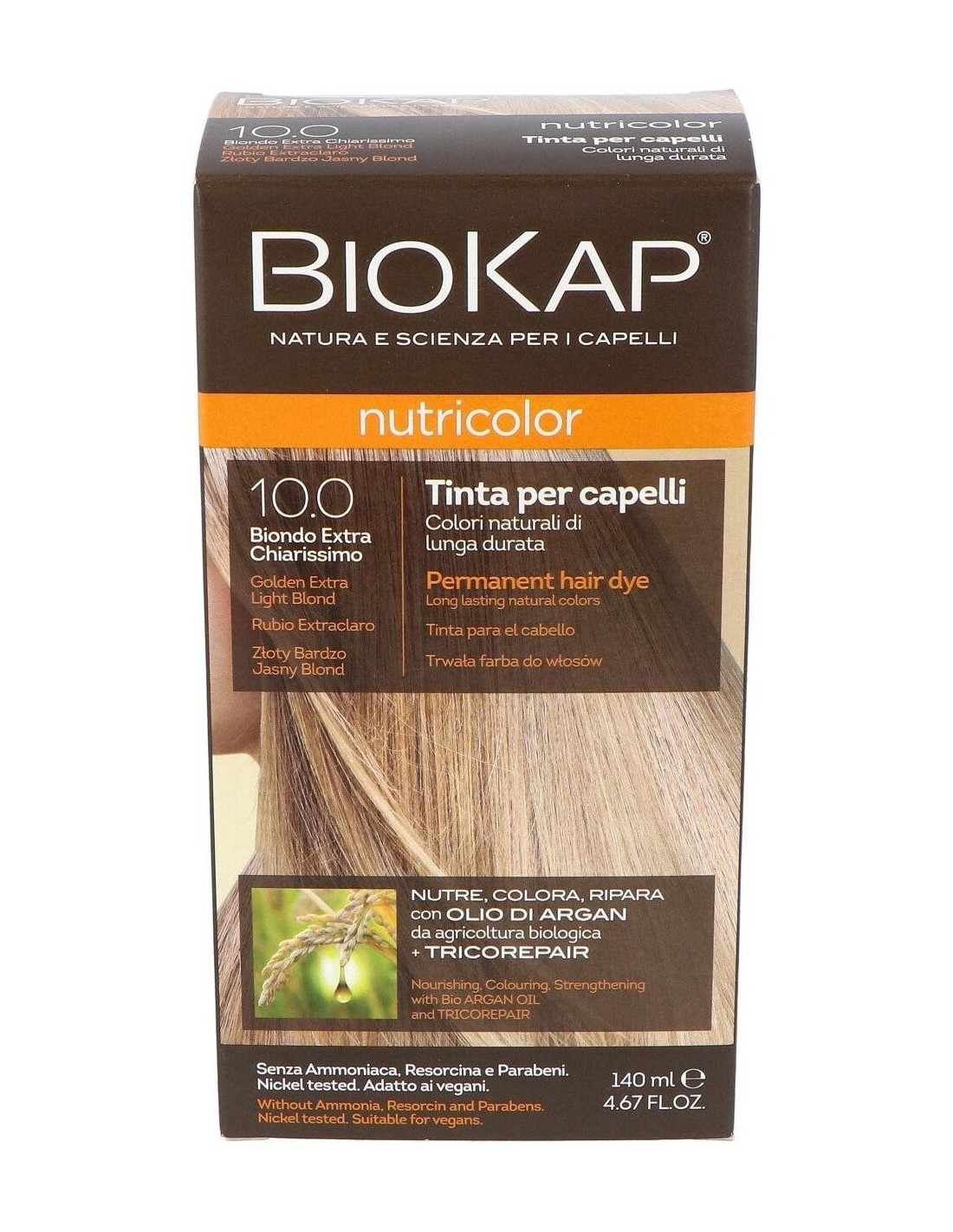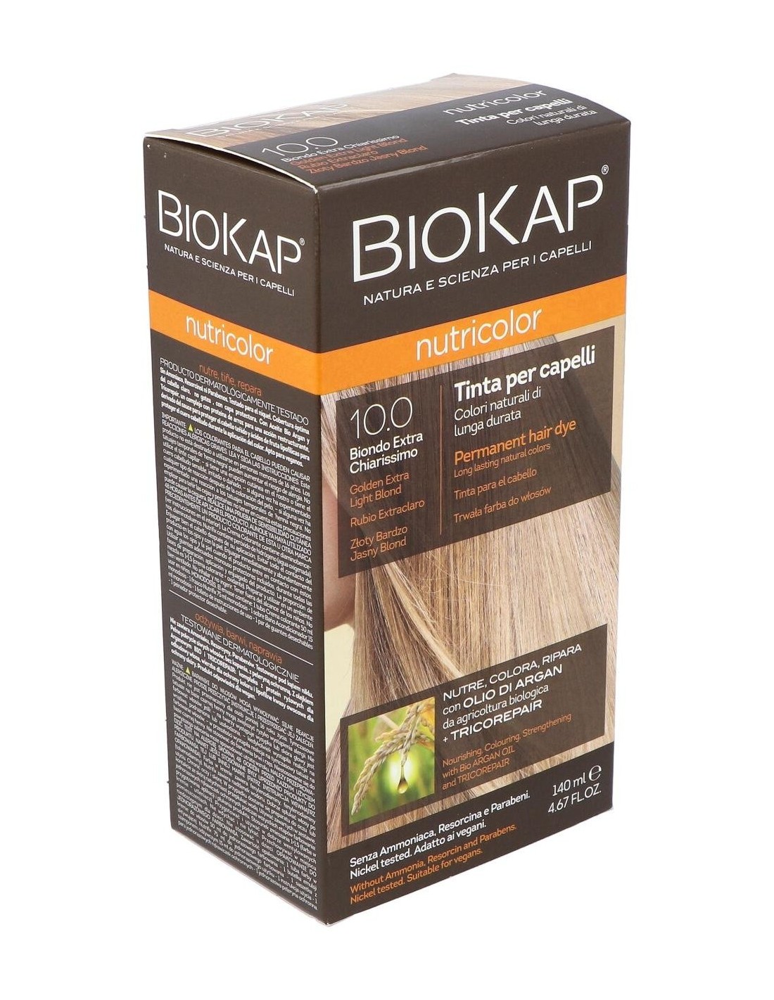 Nutricolor 10.0 Rubio Extra Claro 140 ml de Biokap combina coloración y cuidado, ofreciendo una opción equilibrada para quienes buscan un tono rubio claro con atención al estado del cabello.