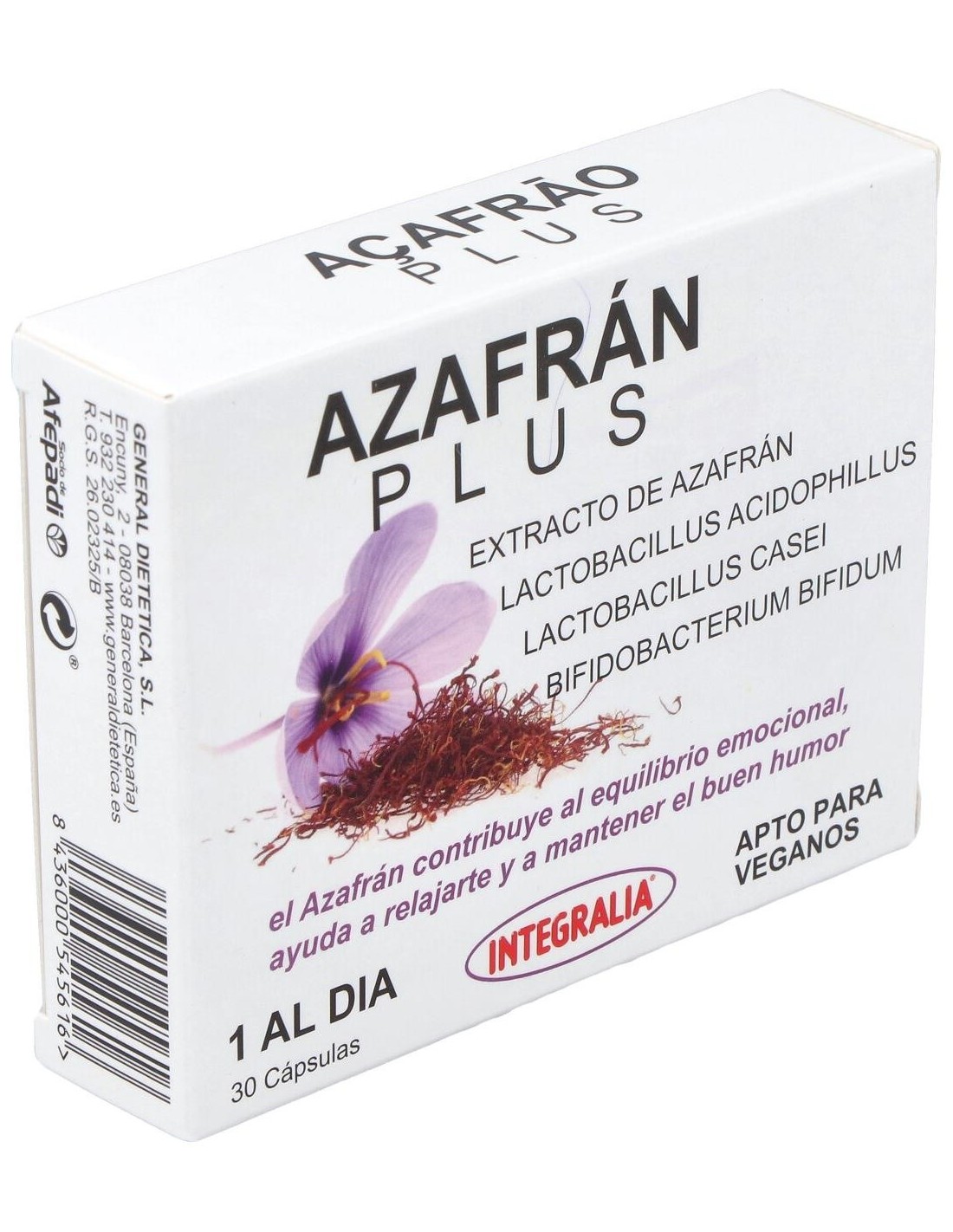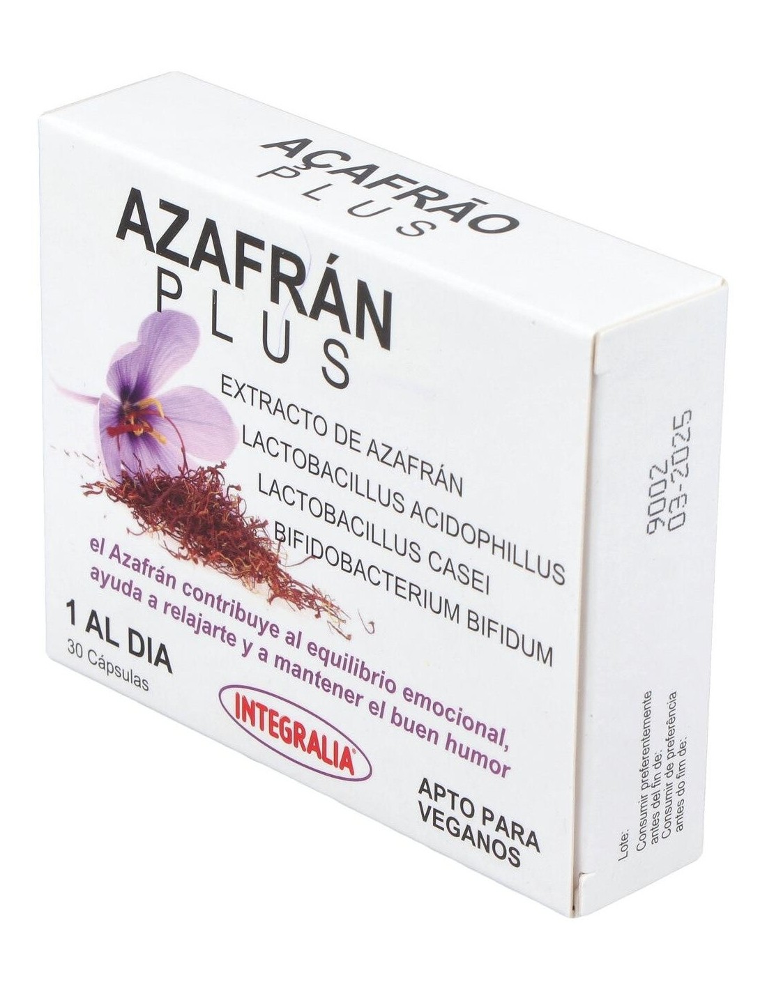 Azafran Plus 30Cap. de Integralia es un complemento alimenticio para personas que buscan apoyar su bienestar emocional. Con extracto de azafrán, contribuye a mantener el equilibrio anímico de forma natural.