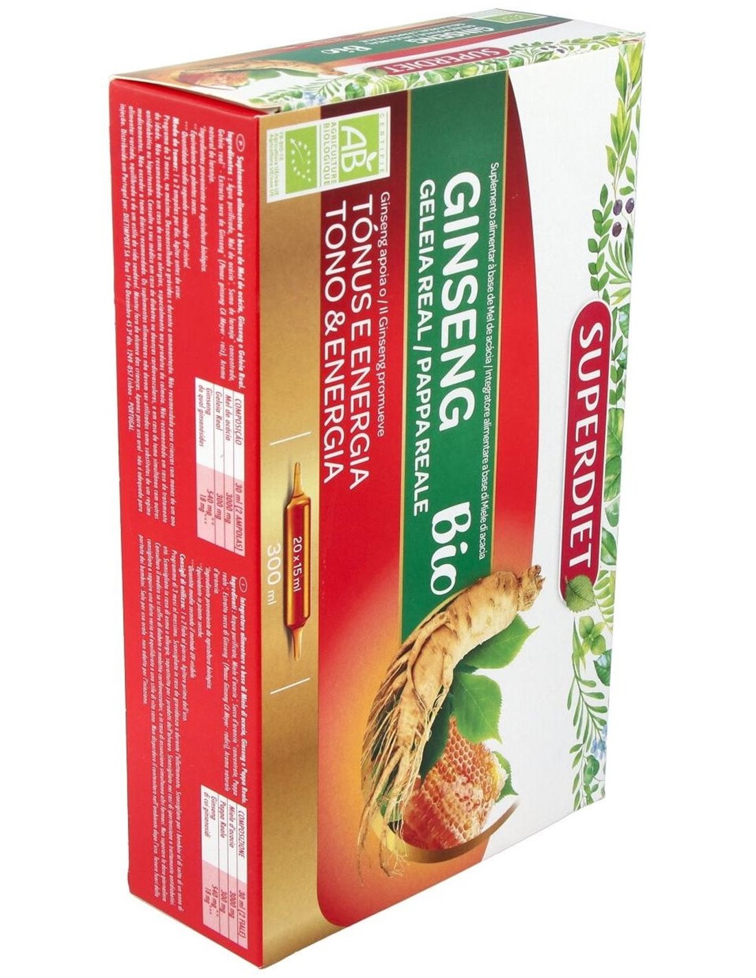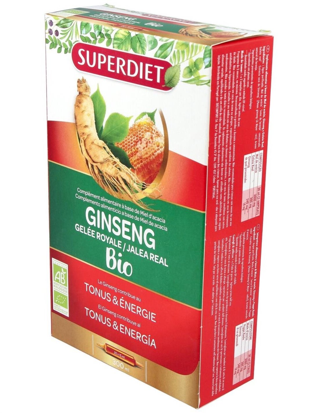 Ginseng+Jalea Real Bio 20Amp. de Superdiet ofrece una combinación equilibrada de ingredientes naturales que contribuyen a complementar la alimentación habitual de forma práctica y respetuosa con el medio ambiente.